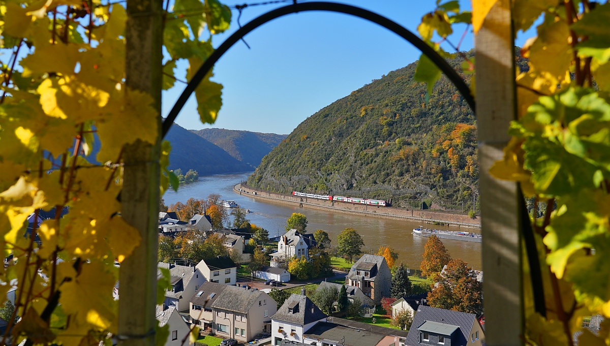 Flirt & Kiss: Zwischen Trier und Koblenz verkehren der RE 1 aus Mannheim und RE 11 aus Luxemburg als Doppel. Von den Weinbergen oberhalb von Treis bot sich am 23.10.2024 dieser Blick ins Moseltal auf zwei Triebwagen der Baureihe 1429 der DB und der Reihe 2300 der CFL auf ihrer Fahrt in Richtung Trier