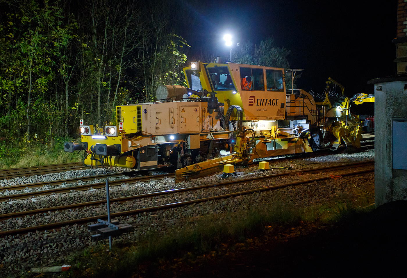 Die Plasser & Theurer Universalstopfmaschine UNIMAT 09-475/4S (Kombinierte Gleis- und Weichenstopfmaschine), Schweres Nebenfahrzeug Nr. D-DGU 99 80 9424 001-2 und die Plasser & Theurer Schotterverteil- und Planiermaschine SSP 110 SW, Schweres Nebenfahrzeug Nr. D-DGU 99 80 9425 068-0, ex 97 16 46 516 18-9 D-DGU (ex Hering Gleisbau, ex Volker-Rail) sind am 27.10.2020 in Herdorf im Einsatz. Das Gleis (Ober- und Unterbau) der Hellertalbahn (KBS 462) wurde zwischen Herdorf und Neunkirchen komplett erneuert.