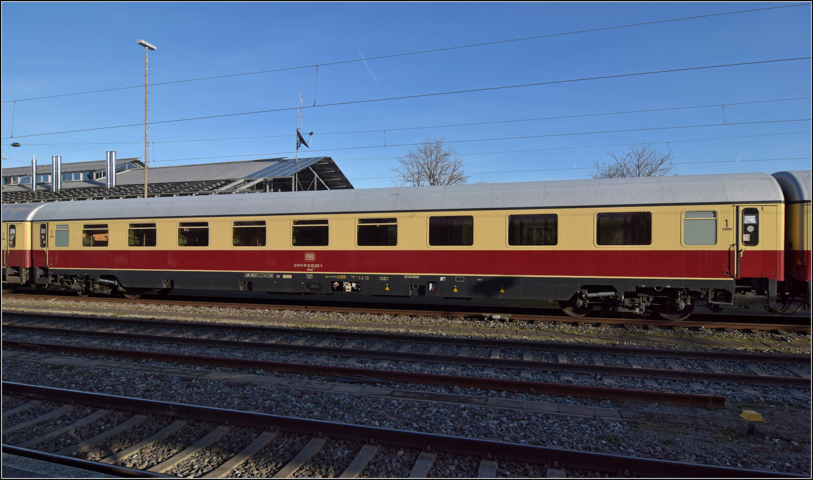 Wagen 3 ist ein Avmz 111.2, 61 80 19-95 029-3. Das v steht für vergrößerte Abteile. Zusammen mit Klimatisierung entspricht dies dem UIC-Z1-Standard. Der kleine Unterschied bei diesem Wagen waren die Scheibenbremsen. Diese Wagen  waren das Rückgrat des internationalen TEE-Verkehrs bei DB-Beteiligung. November 2025.