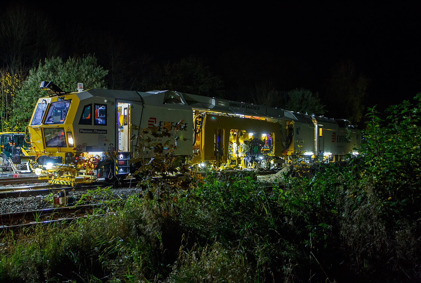 Die Weichen 25 und 26 beim Bahnhof Herdorf sind beide am 12 Oktober 2025 eingebaut, müssen noch eingeschottert werden. Hier sieht man im Bauzustand die provisorisch gelaschten Schienenstöße, zwischen 2 Segmenten der Weichen 26. Die einzelnen Schienenstöße bestehen jeweils aus 2 formschlüssigen Laschen und einer Robel ROCLAMP 68.05 „lang“ Klemme (langer Notlaschenverbinder). Es ist eine formschlüssige und sicheren Verbindung, die je nach Infrastrukturbetreiber bis zu 200 km/h zugelassen sind.