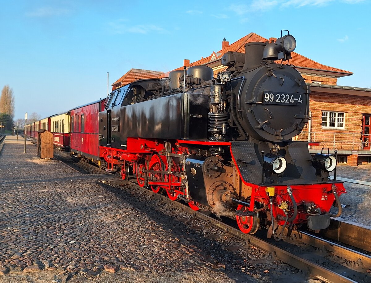 99 2324-4 mit MBB 14615 von Kühlungsborn West nach Bad Doberan kurz vor der Ausfahrt in Kühlungsborn West.09.02.2025
