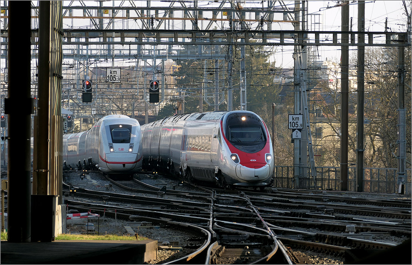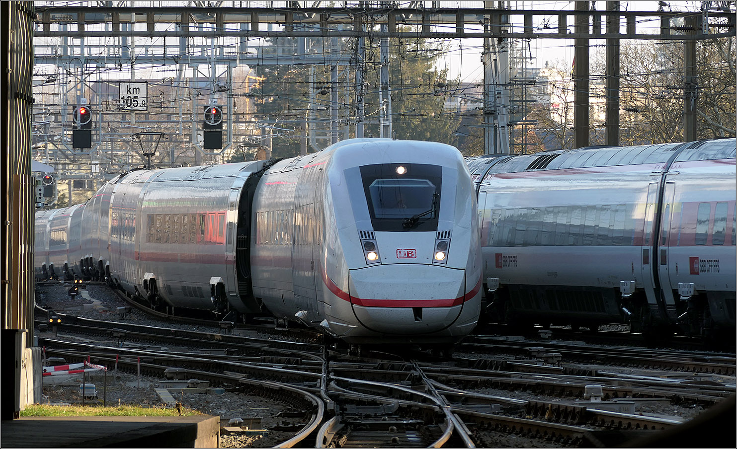 Wie man einen ICE trotz kerzengerader Trasse ausbremsen kann, sieht man hier. Nicht die Altstrecke zweigt von der Neubaustrecke ab, sondern umgekehrt. Da man aber häppchenweise nach Basel weiterbaut, wird über viele Jahre der ICE an beiden Seiten des Katzenbergtunnels ausgebremst um aus der Strecke auszufädeln, während der Nahverkehr mit hoher Geschwindigkeit durchrauscht. Binzen, Dezember 2017.