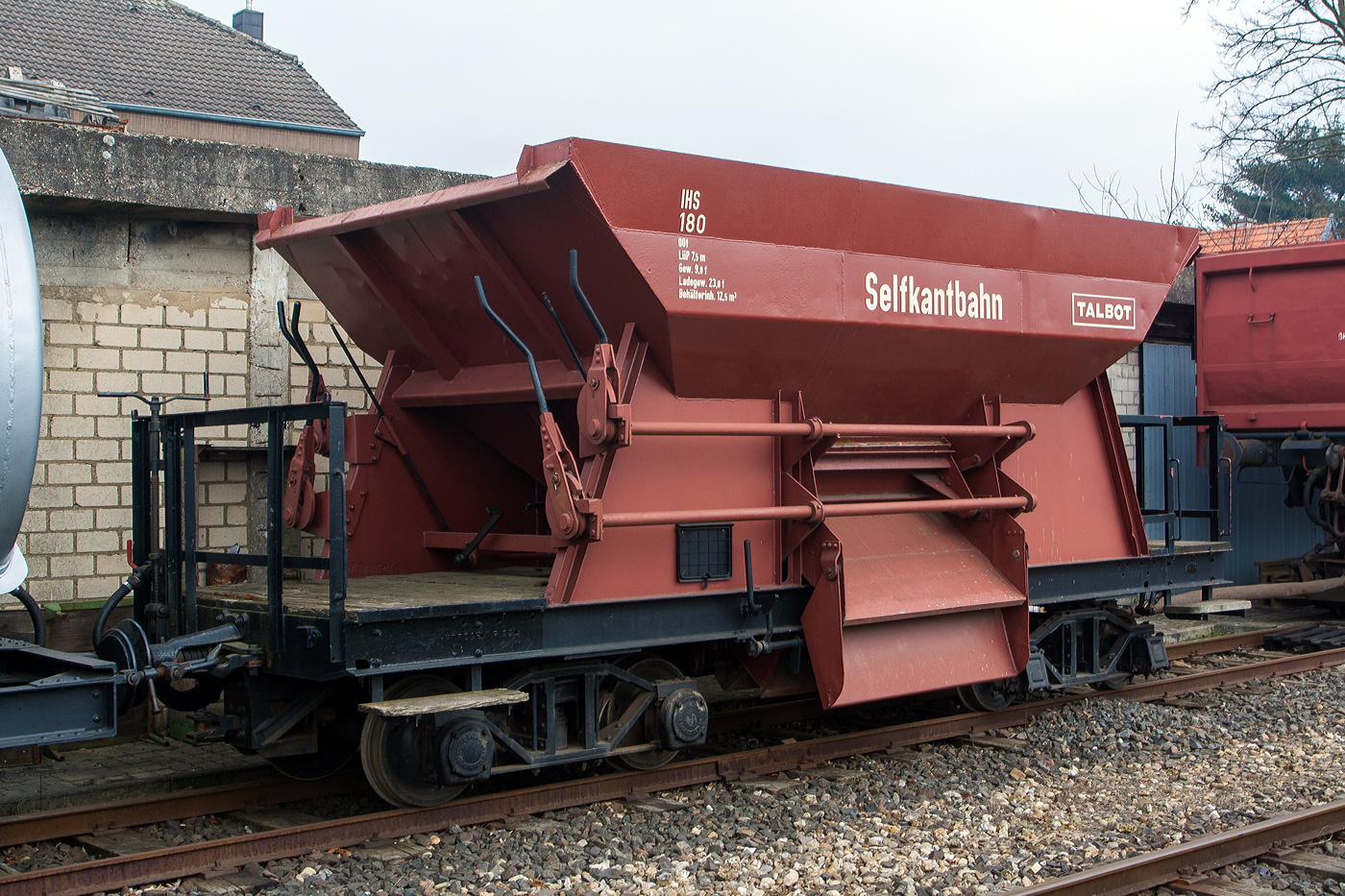 4-achsiger Schmalspur Schotterwagen als Selbstentladewagen mit Schleppkorb 23-026 der MBB - Mecklenburgischen Bäderbahn Molli GmbH, ex LMBV (Lausitzer Braunkohlentagebau) abgestellt am 15.05.2022 im Bahnhof Bad Doberan.
