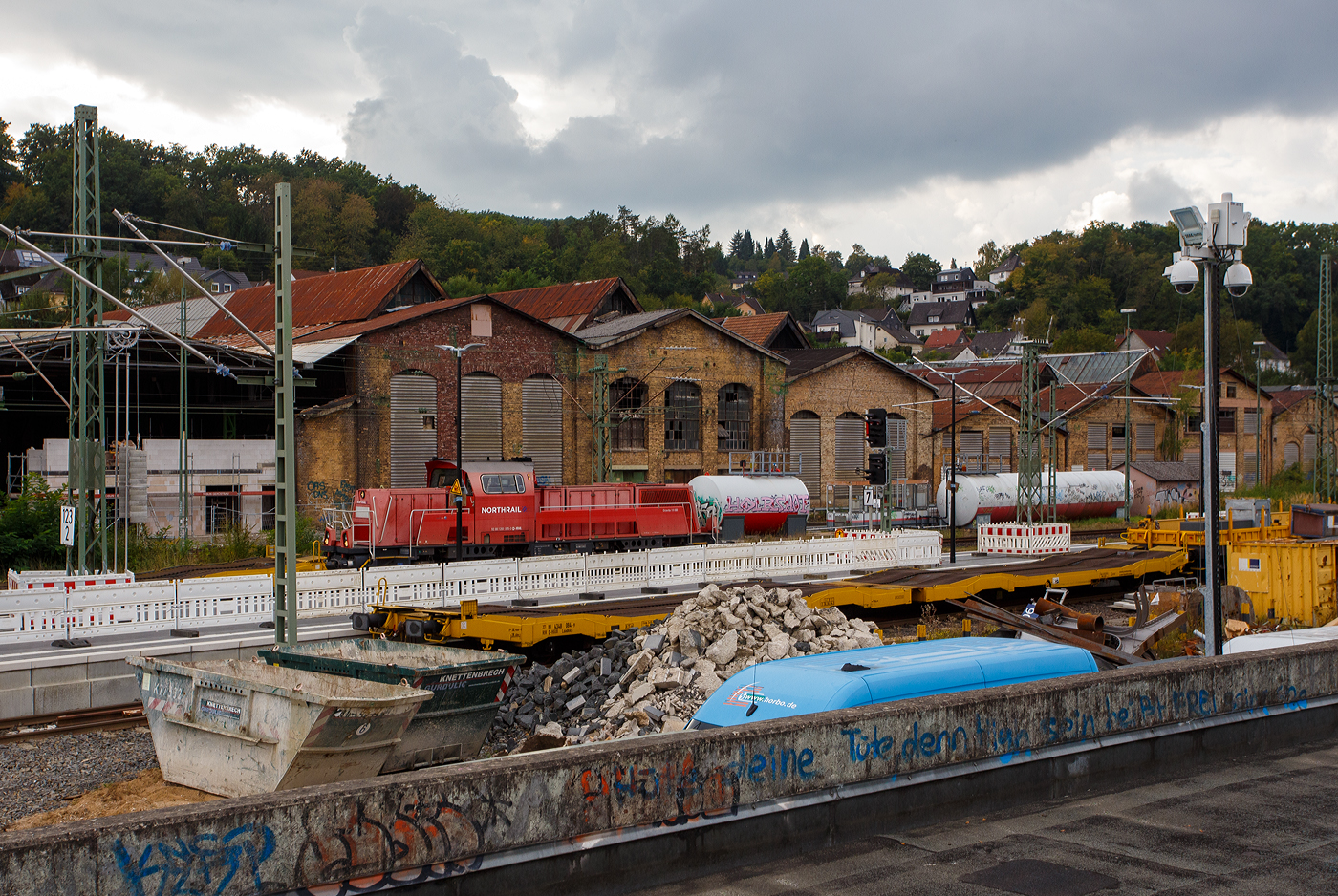 Die an die Hering Bau GmbH & Co. KG (Burbach) vermietete 291 972-8 (98 80 3291 972-8 D-NRAIL) eine Sonderbauart MaK G 1600 BB der Northrail (Hamburg) ist am 09 Januar 2021 auf dem Betriebshof der Westerwaldbahn auf der Bindweide bei Steinebach/Sieg.