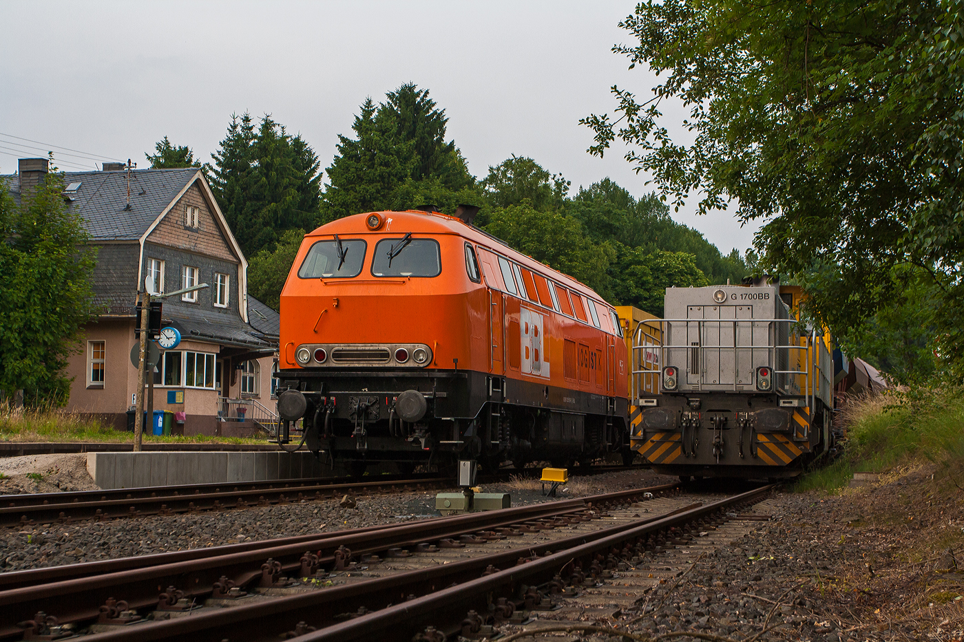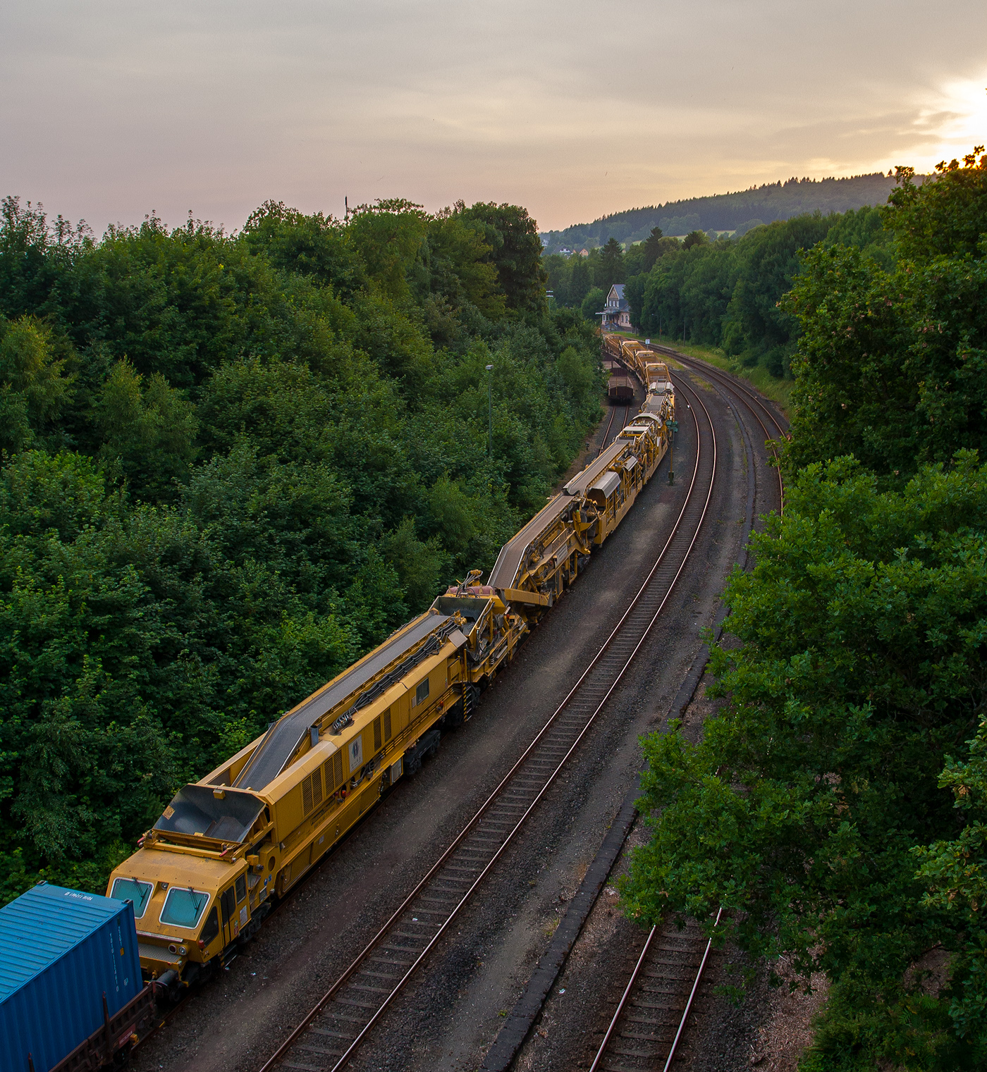 Der 50t-KIROW-Schienenkran EDK 300/5 der Schweerbau, Schweres Nebenfahrzeug Nr. 97 82 31 501 17-9 (ex 60 80 092 3 747-0) mit Schutzwagen 27 80 3349 005-5 D-WVZ, abgestellt am 24.11.2013 in Au/Sieg.