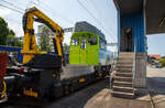 Die BLS „Ameise Lena Alina“ bzw. der Bautraktor Tm 234 382-0 (Tm 98 85 5234 382-0 CH-BLSN) der BLS Netz AG ist am 28.05. 2023 beim Bahnhof Spiez abgestellt.