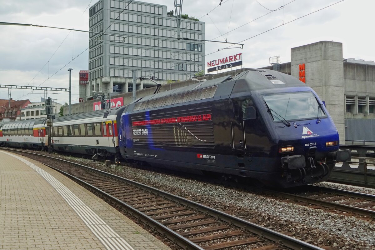 Dei SBB Re 460 085-4 fährt mit dem IR 1709 durch den Bahnhof von Rivaz. Mein Fotostandpunkt befindet sich auf einem noch nicht genutzten Fahrleitungsmast-Betonsockel, da die hier zu sehenden Weichen zur Zeit durch andere weiter Westlich ersetzt werden. Somit werden die in Kürze überflüssig geworden Weichen auch eine Änderung der Fahrleitung nach sich ziehen. 7. Juli 2015