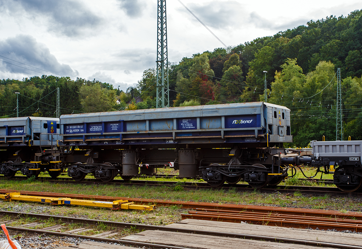 Vierachsiger Drehgestell-Flachwagen mit verschiebbarem Planenverdeck und Lademulden für Coiltransporte, 31 56 4768 059-6 SK-ZSSKC, der Gattung Shimms, des slowakischen Wagonvermieters AXBENET s.r.o. (Trnava), eingestellt durch die ZSSK Cargo (Železničná spoločnosť Cargo Slovakia), am 10.03.2022 im Zugverband bei einer Zugdurchfahrt in Rudersdorf (Kr. Siegen).