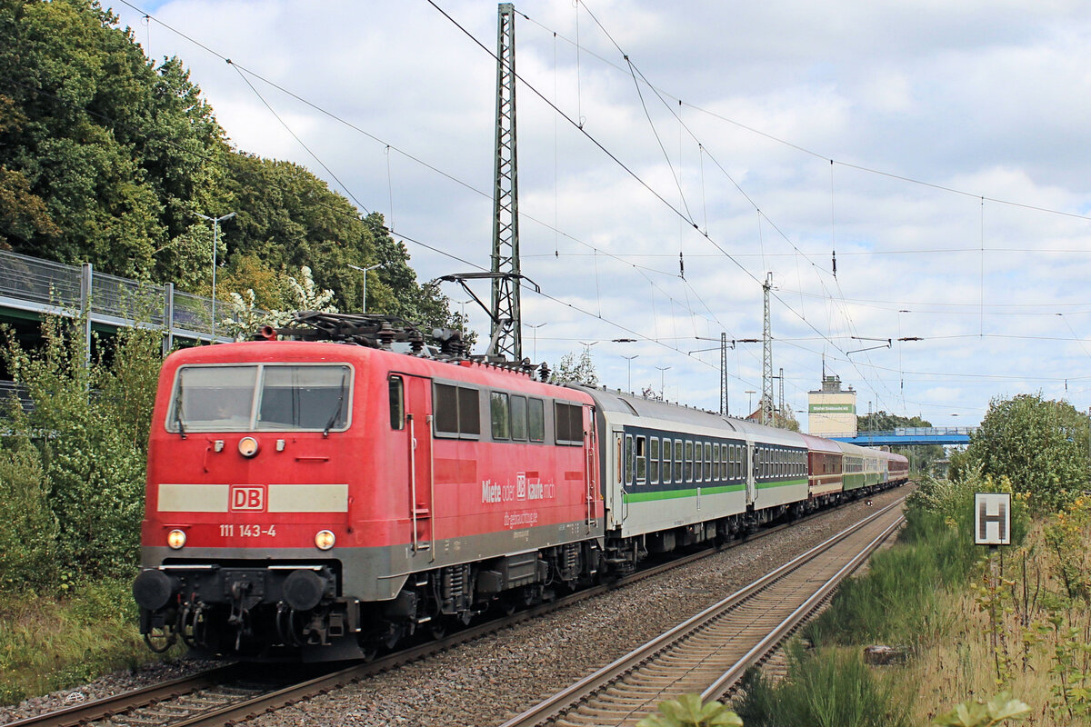 111 143-4 mit einen bunten Sonderzug am Haken, durchfährt am 21.09.2025 den Bf Tostedt.