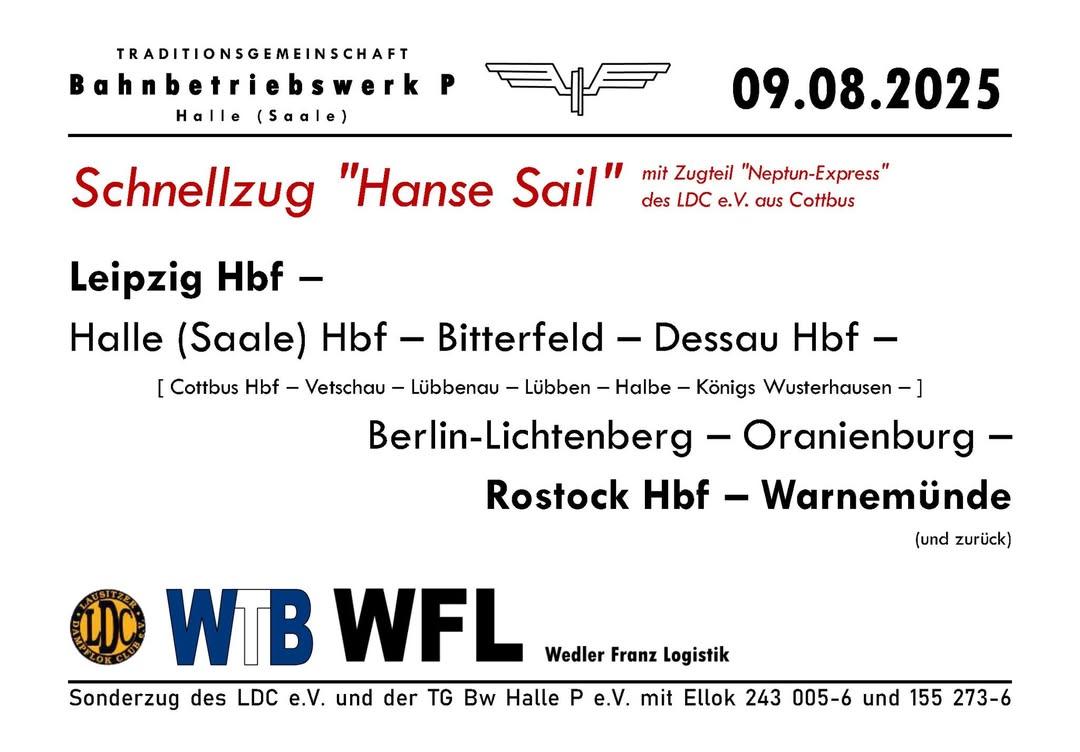 Am 09.08.2025 geht es mit dem Schnellzug  Hanse-Sail  Von Leipzig Hbf nach Warnemünde zur Hanse-Sail zurück,inklusive Stadttour in Berlin