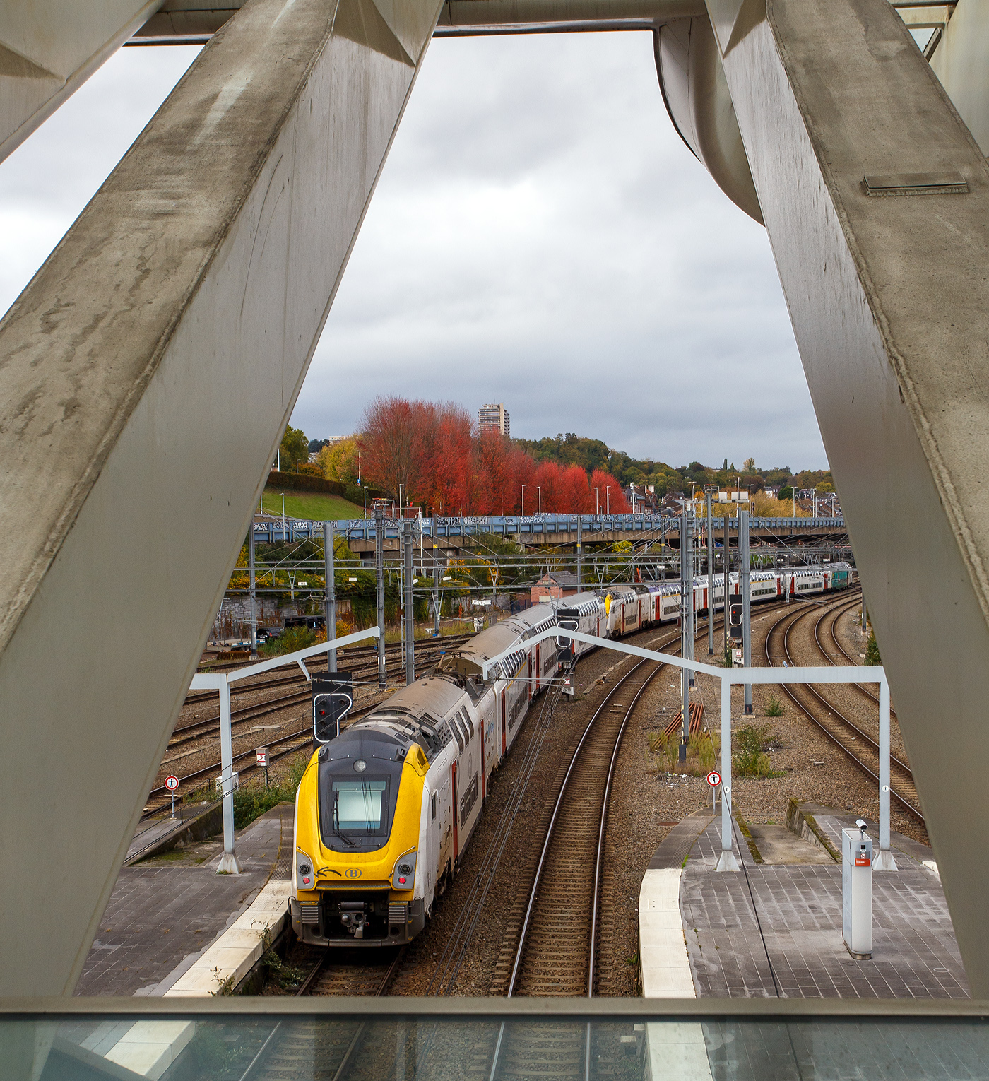 Zwei Triebzüge am 21 Oktober 2025 im Bahnhof Liège-Guillemins (Lüttich-Guillemins) nebeneinander. Vorne der Siemens Desiro ML SNCB/NMBS Triebzug AM 08551 (AM = Automotrice), als L-train (Lokalzug/Regionalzug) über Angleur (Stadtteil von Lüttich) nach Bomal. Dahinter ein langen M7 TWINDEXX-Triebwagen-Zug, als IC über Brüssel Flughafen, Gent und Brügge, an die Küste nach Knokke.