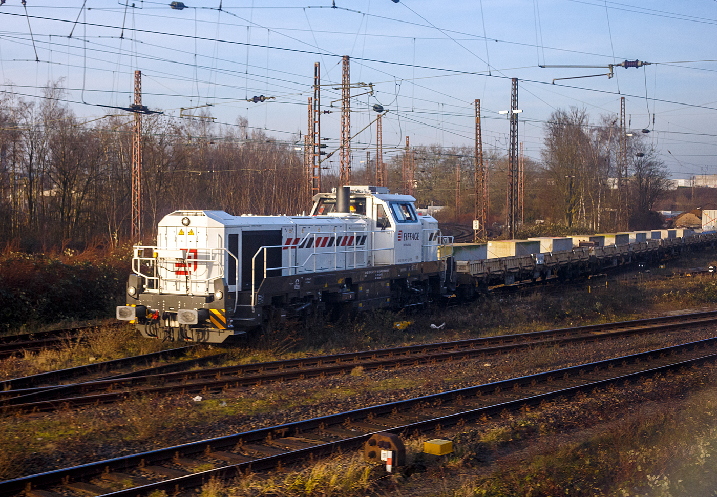 Die 4185 142-1 (92 80 4185 142-1 D-ERD) eine dieselelektrische Vossloh DE 18 der Eiffage Infra-Rail GmbH schient einen Bauzug am 21 Januar 2025 in den Abstellbereich (Schieneninfrastruktur) der Eiffage Infra-Rail GmbH in Herne (ehemals Heitkamp Rail GmbH). Bild aus einem IC heraus. Die DE 18 wurde 2023 von der Vossloh Rolling Stock GmbH (teil der chinesischen CRRC-Gruppe) in Kiel unter der Fabriknummer 5502565 gebaut und im November 2023 an die Eiffage Infra-Rail GmbH in Herne geliefert, die in Deutschland 4 dieser DE 18 besitzt. Eiffage ist ein börsennotiertes französisches Bauunternehmen mit Firmensitz in Vélizy-Villacoublay. In Deutschland hat die Eiffage Infra-Rail GmbH ihren Sitz in Herne. Im Jahre 2010 übernahm Eiffage von Heijmans den Bereich Schieneninfrastruktur der ehemaligen Firma Heitkamp. Die Gleisbaugeräte und die zugehörige Werkstatt sind auf dem Gelände der ehemaligen Heitkamp Bauholding in Herne-Wanne beheimatet.