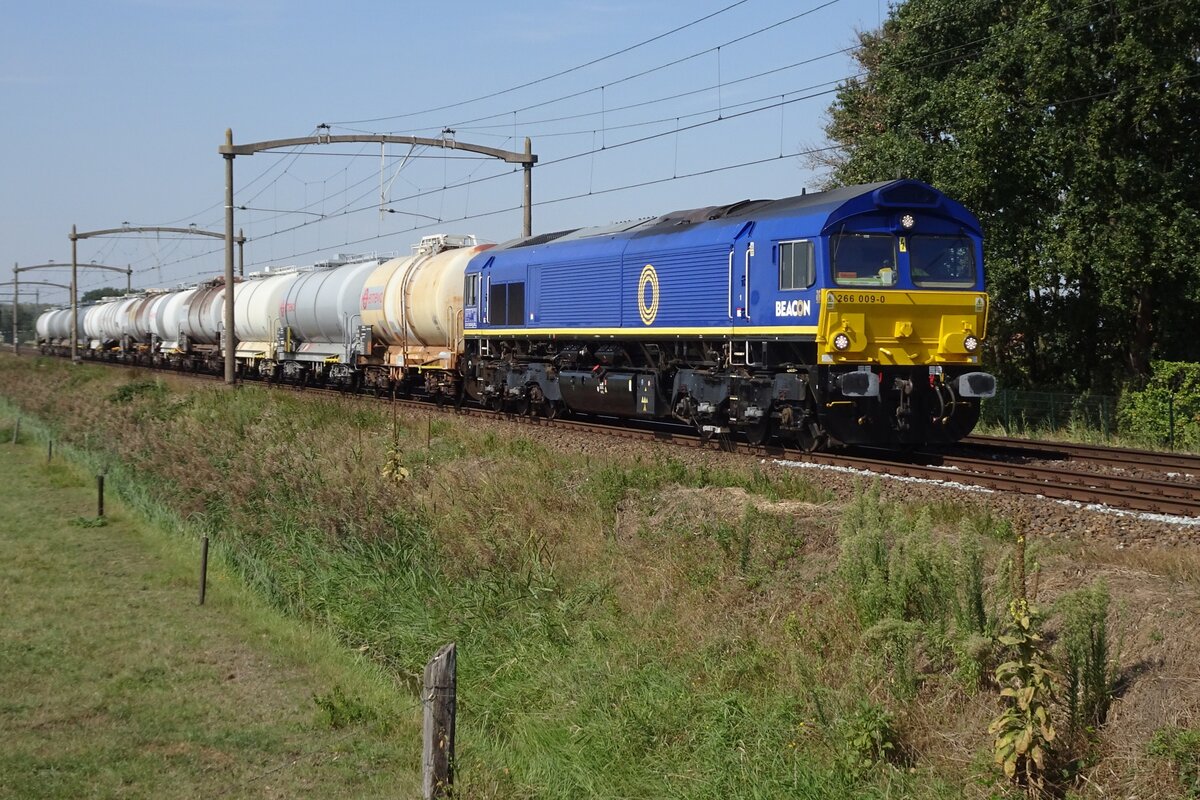 RailTraxx 266 009 zieht ein Containerzug durch Venlo-Vierpaardjes, wo eine der zwei Bahnübergänge doch bewahr geblieben ist, am 6 Dez\ember 2025 und wird vom offenbarer Stelle fotografiert. Leon Schrijvers