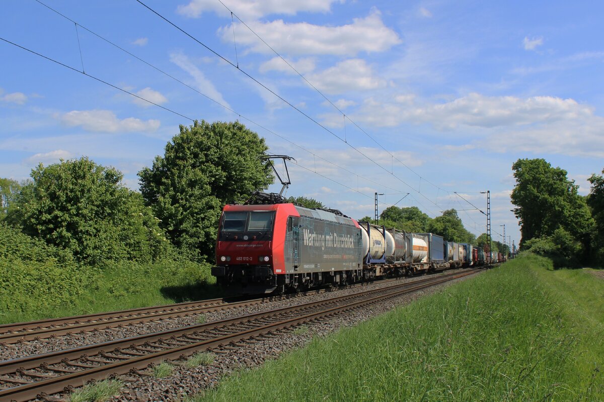 Die an die TX Logistik AG vermietete Re 482 021-3 (91 85 4482 021-3 CH-SBBC) der SBB Cargo AG fährt am 25.Mai 2023, mit einem Kesselwagenzug durch den Hauptbahnhof Siegen in Richtung Dillenburg bzw. Frankfurt.
