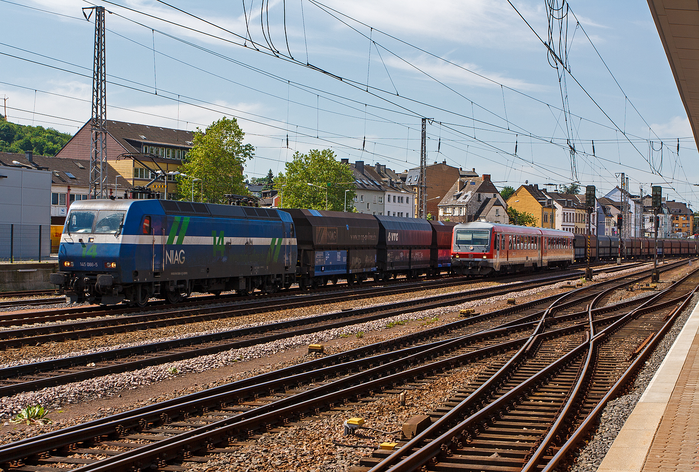 Die 145 023-6 "120 Jahre Rasender Roland - RüBB" eigentlich die 145 083-2 (91 80 6145 083-2 D-PRESS) der PRESS - Eisenbahn-Bau- and Betriebsgesellschaft Pressnitztalbahn mbH (Jöhstadt), ex SBB Cargo Re 481 001-6, ex MThB Re 486 651-3, hat zu meinem Glück, am 30.08.2016 mit einem Güterzug am Haken im Bahnhof Gießen Hp 0.