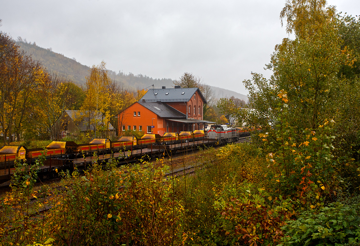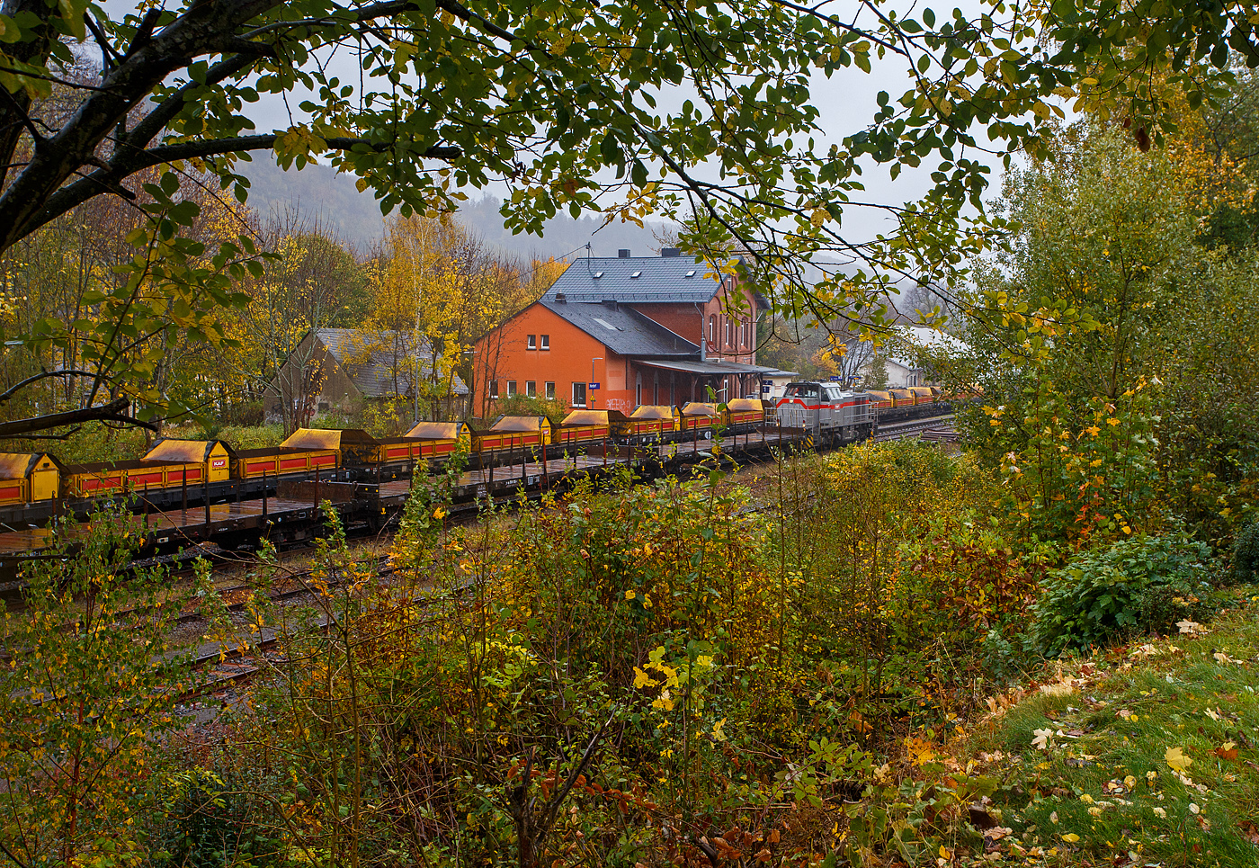 Noch haben sie am 28.10.2021 im Bahnhof Herdorf auf Gleis 4 Hp 0 und müssen den Gegenzug RB 96 – Hellertalbahn abwarten, die Mietlok die Voith Maxima 30 CC – VTLT 263 005-5 (92 80 1263 005-1 D-VTLT) der Voith Turbo Lokomotivtechnik GmbH & Co. KG am Haken der KSW 43 (92 80 1273 018-2 D-KSW) der KSW (Kreisbahn Siegen-Wittgenstein) bevor es von Herdorf in Richtung Betzdorf (Sieg) weiter geht.