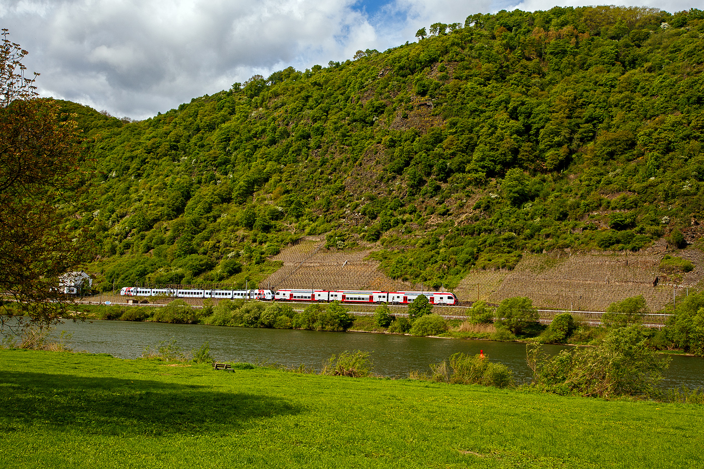 Eine Lok der Baureihe 185.2 der DB Cargo fährt am 28 April 2018 zwischen Hatzenport und Moselkern mit einem gemischten Güterzug Moselaufwärts in Richtung Trier. Rechts oben die Burg Bischofstein.