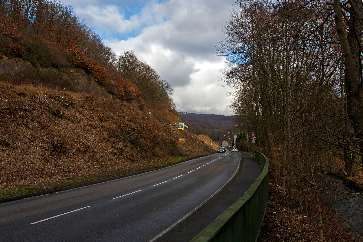 Der fünfteilige Stadler FLIRT 429 047 / 547 der HLB (Hessischen Landesbahn), fährt am 18.03.2021, als RE 99 (Main-Sieg-Express) Siegen - Gießen - Frankfurt am Main, durch Rudersdorf (Kr. Siegen), an der Dillstrecke (KBS 445), in Richtung Dillenburg.