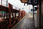 2 x 2 achsiger leerer offener Doppelstock-Autotransportwagen (Wageneinheit) 25 80 4382 103-6 D-ATG der Gattung Laaeffrs 561 der DB Cargo Logistics GmbH (ex ATG Autotransportlogistic GmbH) am 22.02.2023 im Zugverband bei der Durchfahrt in Kirchen (Sieg).