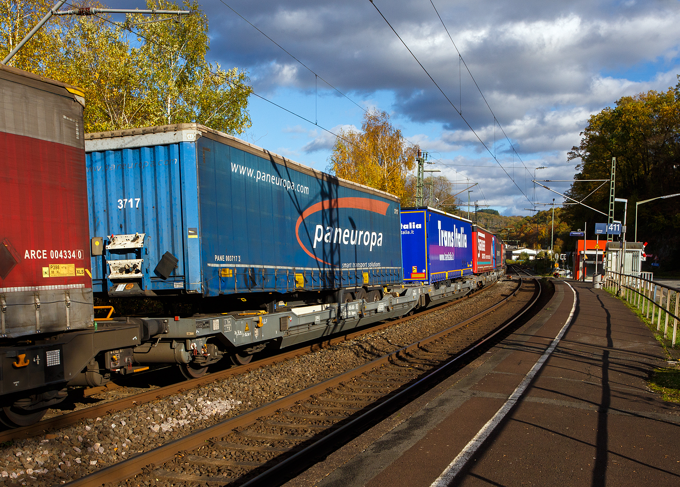 Sechsachsige Drehgestell-Gelenk-Containertragwagen-Einheit / 6-achsiger Containertragwagen, 33 87 4901 507-6 F-ERSA, der Gattung Sggmrss 90', der französischen Vermietungsfirma ERMEWA S.A., am 05 Oktober 2024 im Zugverband, direkt hinter der Vectron AC193 922-2 der Northrail GmbH, im Zugverband bei der Zugdurchfahrt in Rudersdorf (Kr. Siegen). Hier beladen mit einer Wechselbrücke und einem 45-Fuß-ISO-Containern.