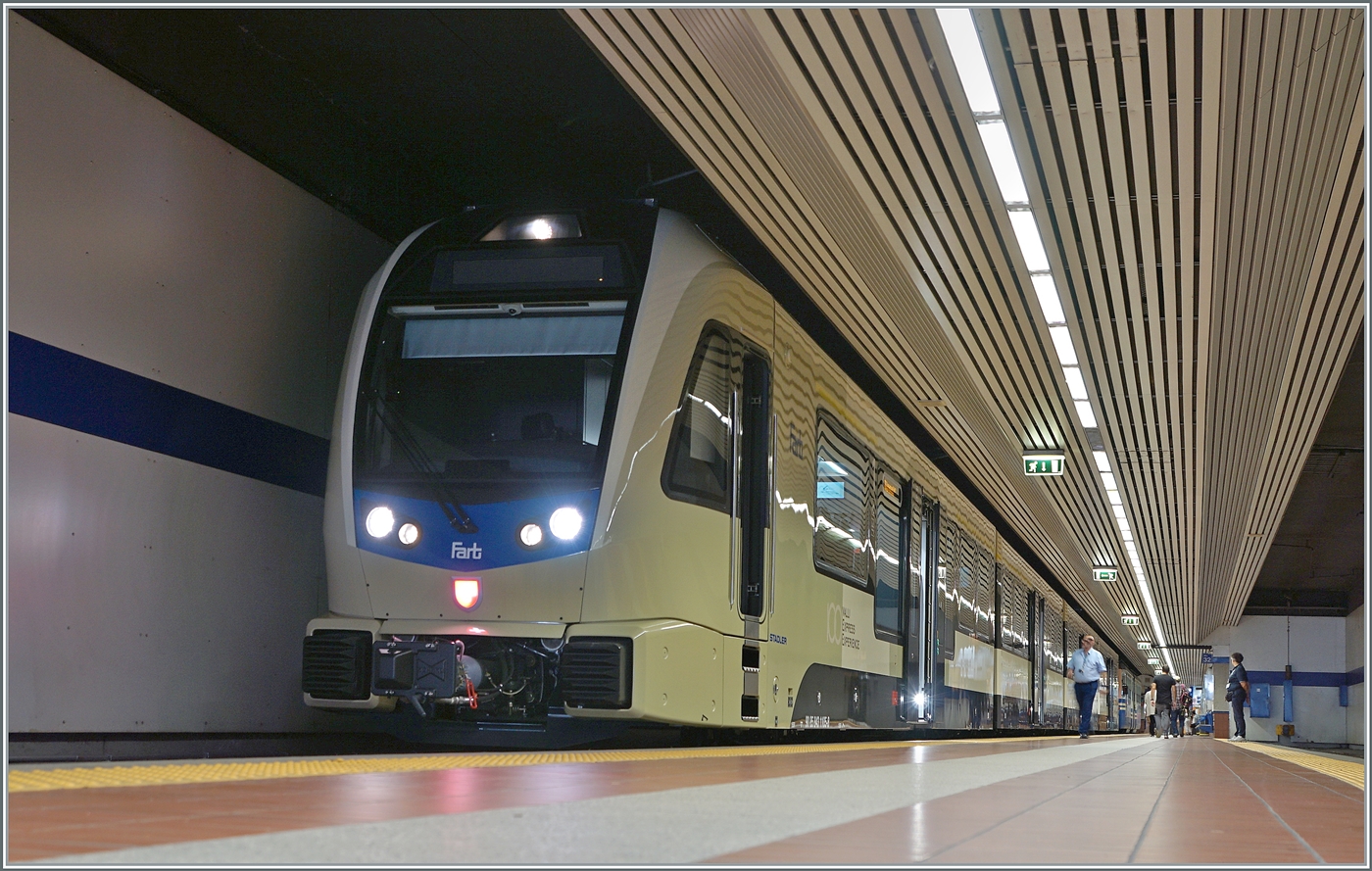 Der neue FART ABe 8/16 (UIC 90 85 1105-8) wartet im unterirdischen SSIF Valle Vigezzo Bahnhof als PE 72 47 auf die Abfahrt nach Locarno. 22. August 2025
