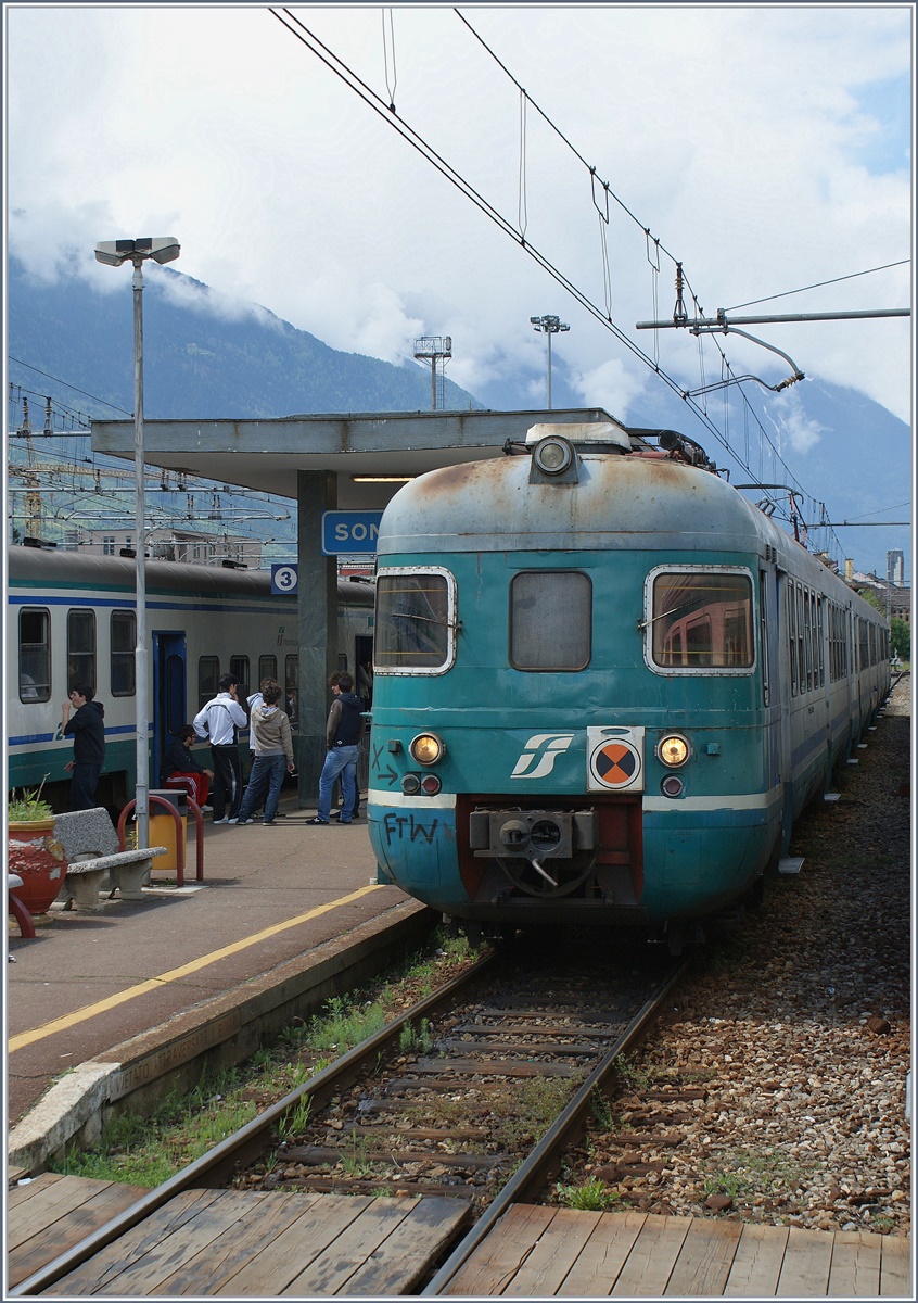 Ein FS Ale 803 wartet in Tirano auf die Abfahrt nach Sondrio. Leider sind die formschönen Triebzüge inzwischen nicht mehr in Betrieb.
