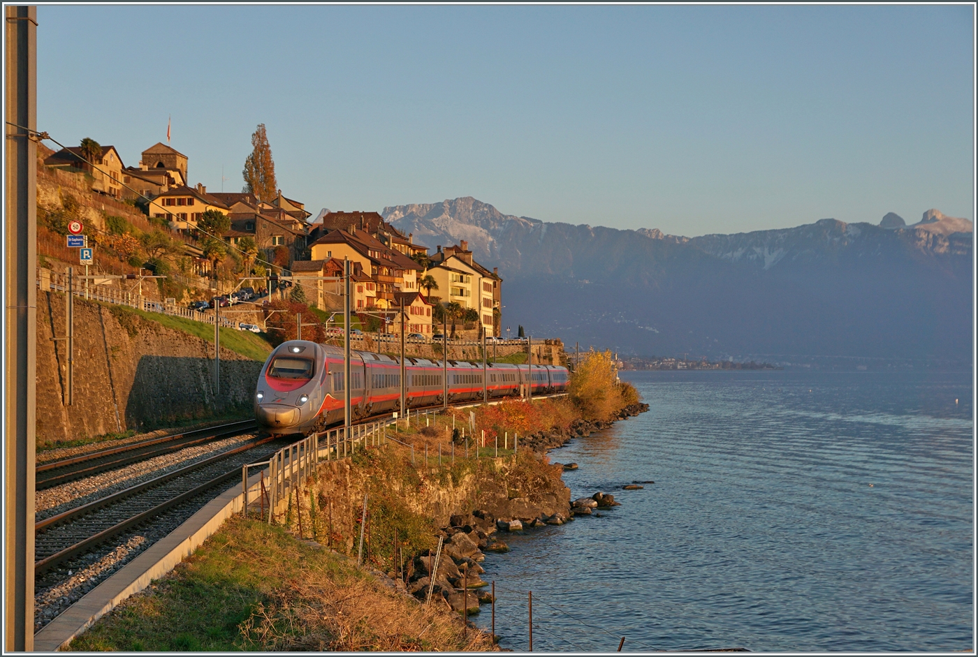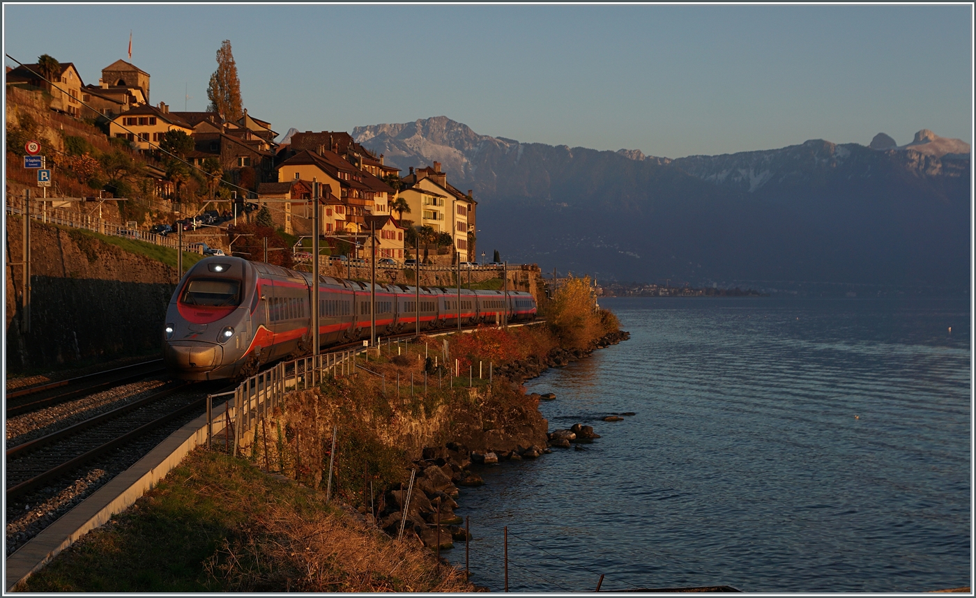 Im Gegenlicht fährt ein FS Trenitalia ETR 610 als EC 34 Richtung Genève durch den Bahnhof von Gallarate.