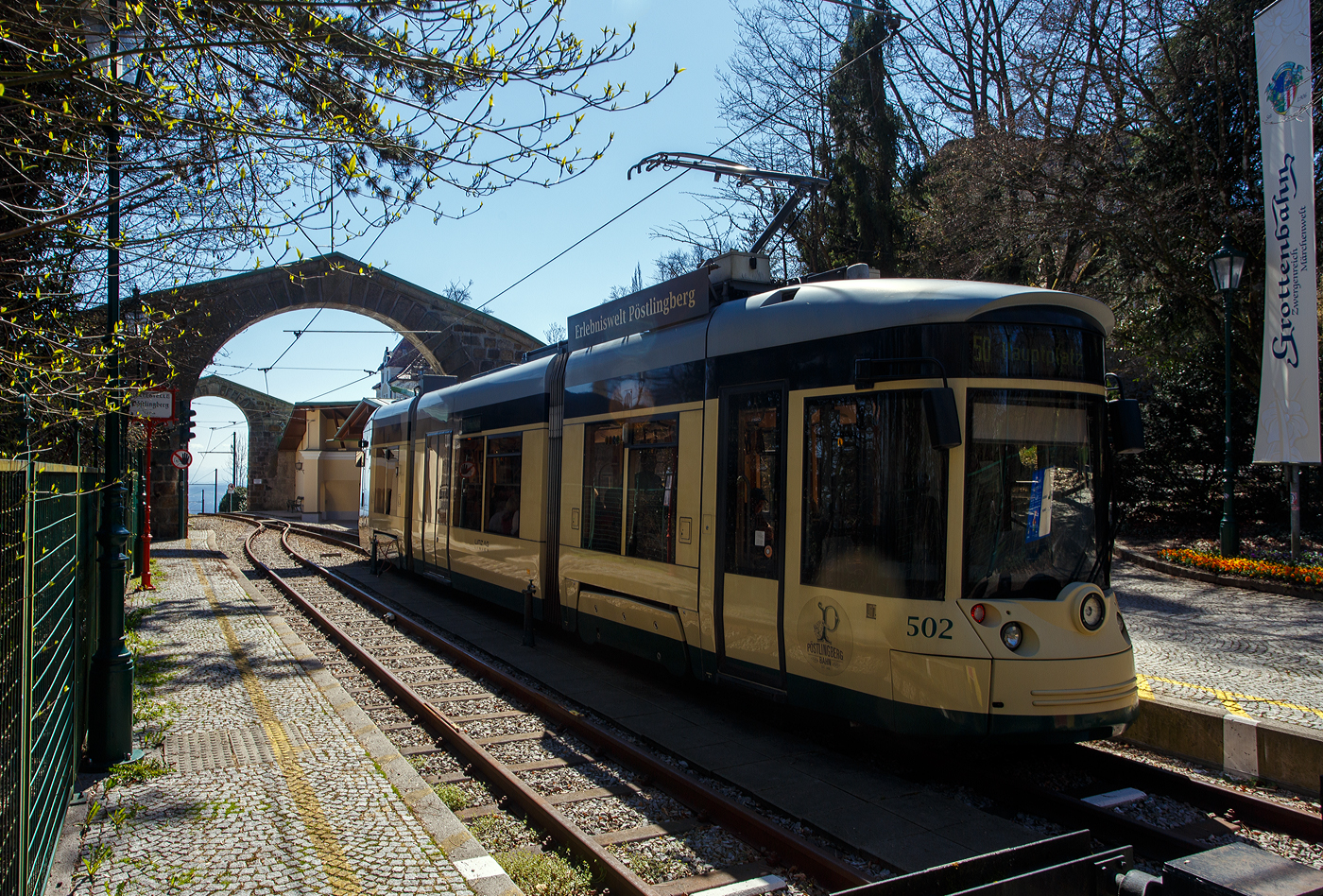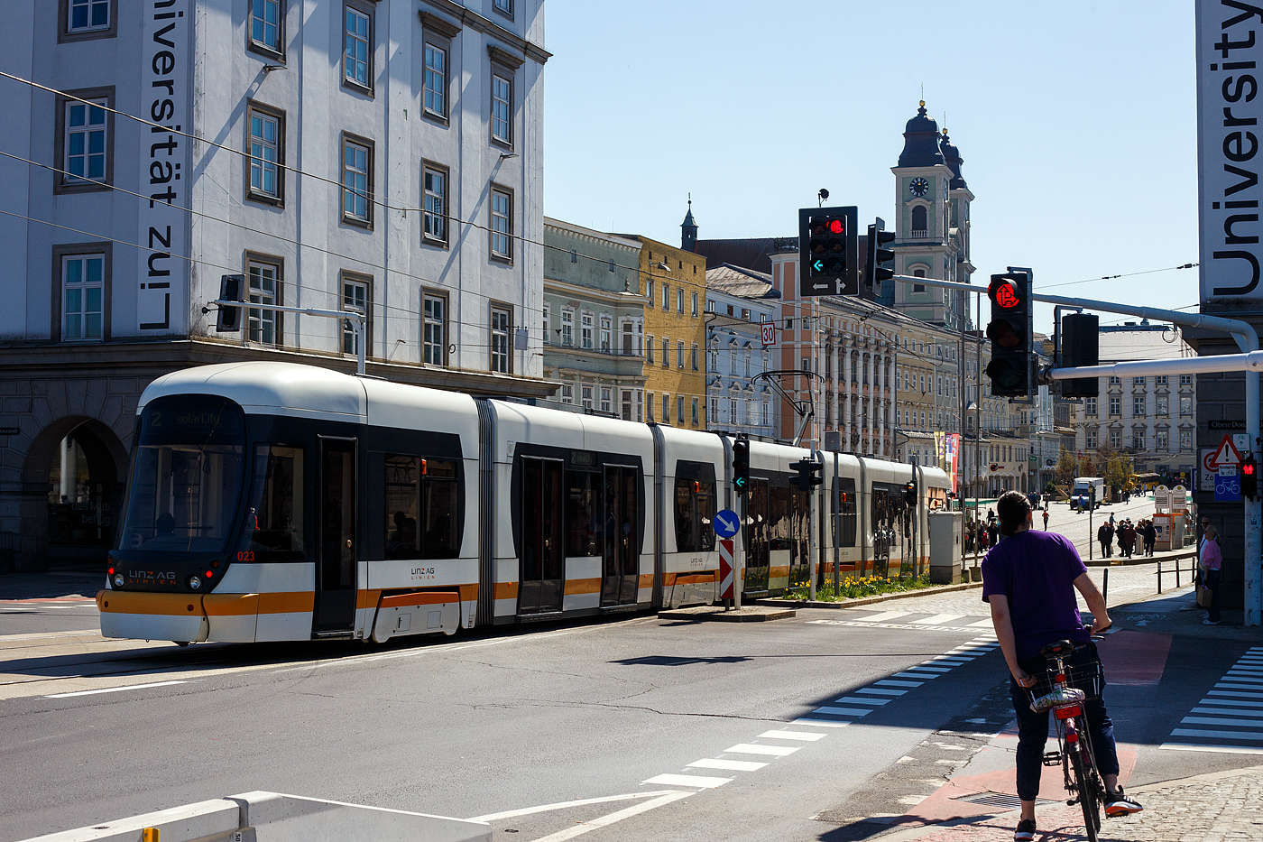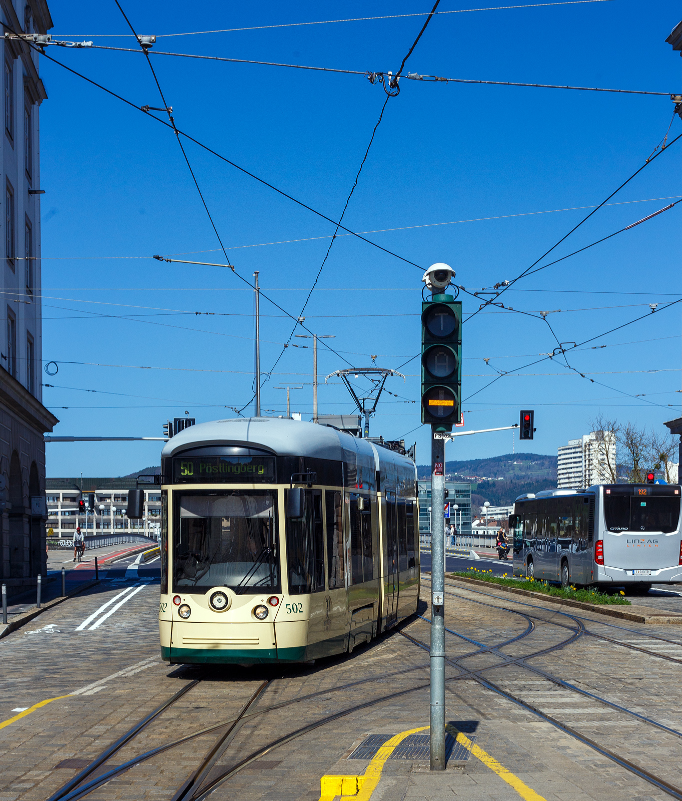 Der Triebwagen 068, ein siebenteiliger Niederflur-Straßenbahn-Einrichtungswagen vom Typ Bombardier Cityrunner 2 bzw. Flexity Outlook C der Straßenbahn Linz/Donau (A), betrieben durch die Linz Linien GmbH, als Linie 4 zum Schloss Traun, hat am 04. April 2025 gerade die Donau überquert und erreicht als bald die Haltestelle Hauptplatz Linz.