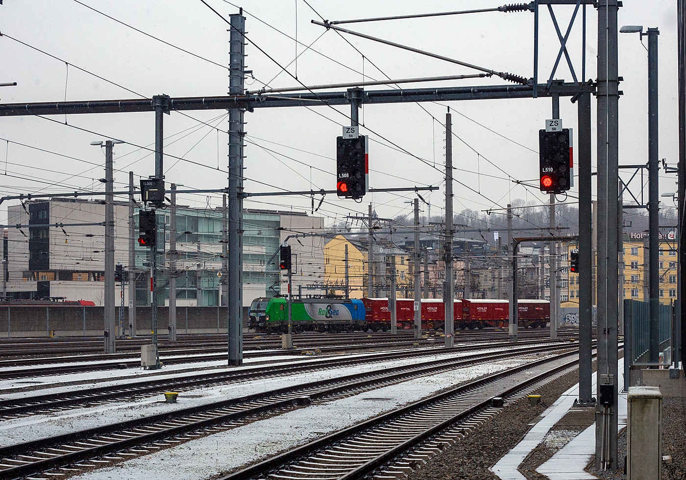 Noch im Outlook der Rail&Sea Logistics GmbH (Seekirchen am Wallersee), aber nun an die ÖBB-Produktion GmbH vermietete SIEMENS Vectron MS 6193 193 (91 80 6193 273-0 D-ELOC) der ELL - European Locomotive Leasing (Wien) fährt am 15 Januar 2025 mit einem kurzen Rail Cargo MOBILER Multitainer Zug (2 achtachsige Drehgestell-Containertragwagen-Einheiten) durch den Hauptbahnhof Salzburg in Richtung Osten.