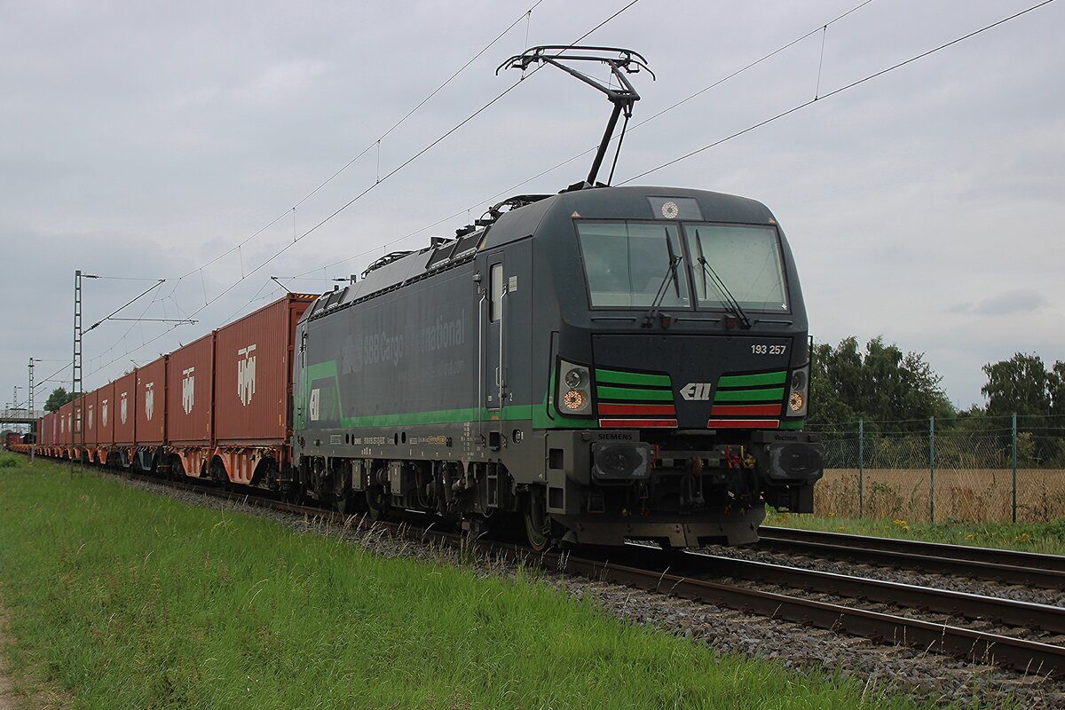 LTE 193 257 tragt noch immer die Spüren von die SBBCI Aufkleber am 8 Augustus 2025 beim durchfahren von Kaarst Broicherseite.