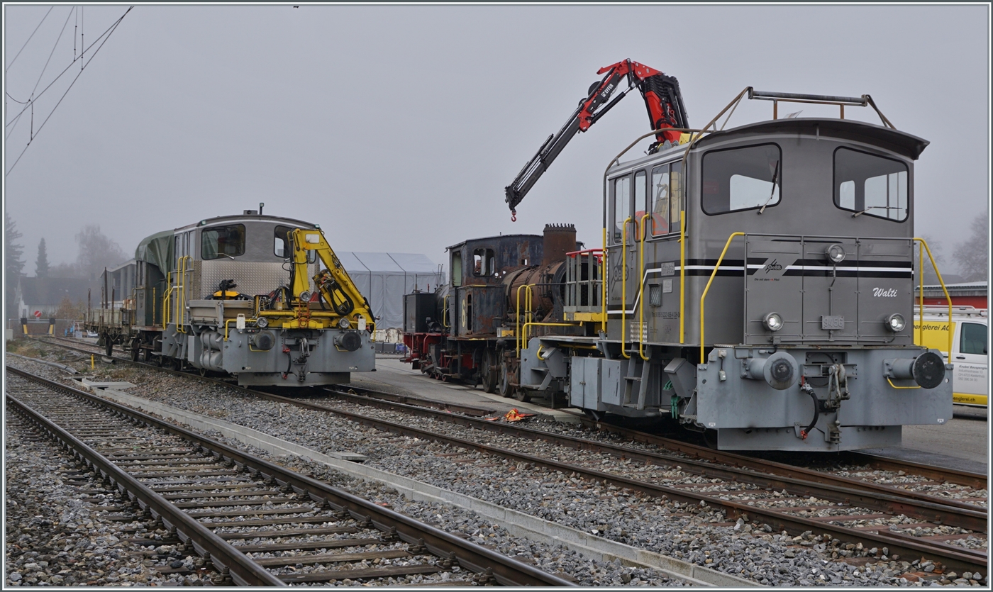 Es war nicht ganz klar, wohin die "Fahrt" geht: werden die im Hintergrund zum Teil zerlegten Dampfloks zur Aufarbeitung aufgeladen oder zur Verschrottung? Balsthal, den 8. Nov. 2025