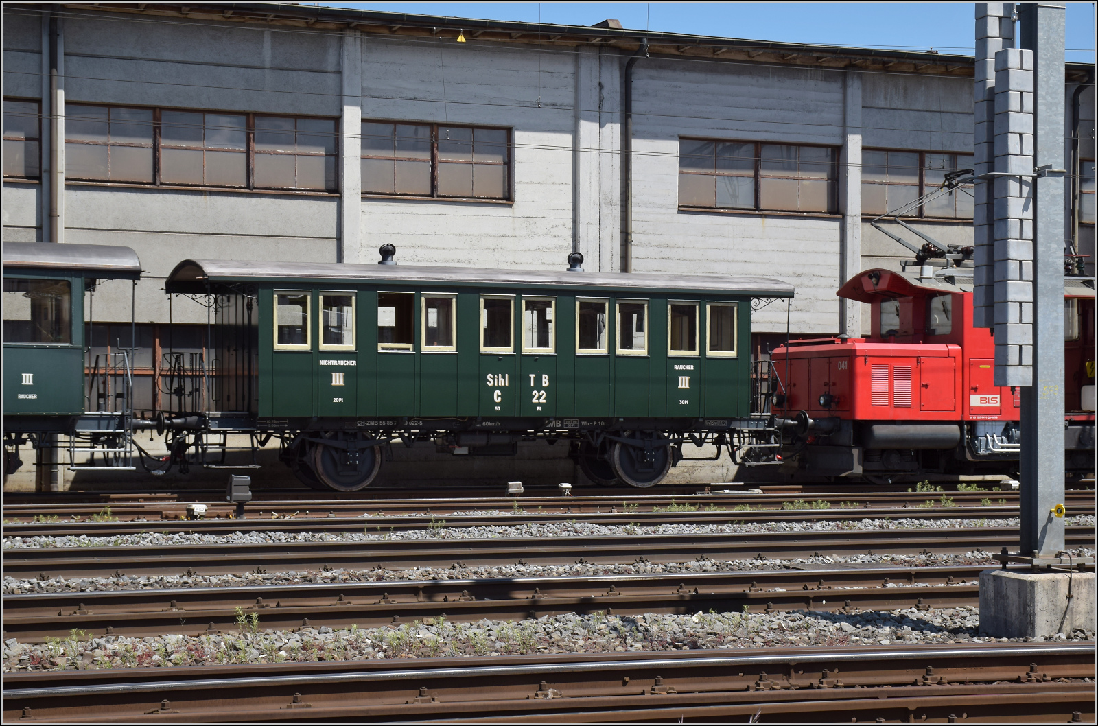 Vorne sind die jüngsten zweiachsigen Personwagen der Schweiz, deren Serie wider den Zeitgeist noch 1927-1929 von der SIG für die Sihltalbahn gebaut wurde. C 68 und C 69 sichtet man zumeist im Doppelpack. Hinten ist C 22 aus der Originalausstattung der Sihltahlbahn aus dem Jahr 1892 der in der Westschweiz und in Frankreich dem Recyclingkreislauf entkam.