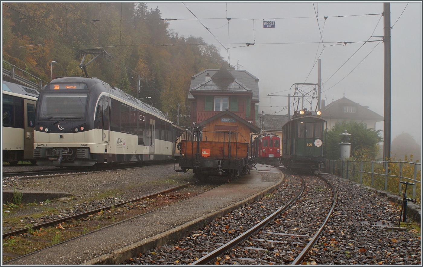 La DER de la Saison / Das Saison Ende der Blonay Chamby Bahn 2025 - Seit einigen Jahren zeigt die Blonay Chamby Bahn zum Saison Ende mit einem verdichteten Fahrplan noch einmal ihre herrlichen Fahrzeuge im Einsatz: Viel Verkehr in Chamby auf Gleis 3 warte der CGTE Fe 4/4 151 auf Anschlussreisende der MOB und auf den beiden MOB Gleisen kreuzen sich zwei MOB PE30 Regionalzüge Zweisimmen - Montreux, resp Montreux - Zweisimmen. 25. Okt. 2025