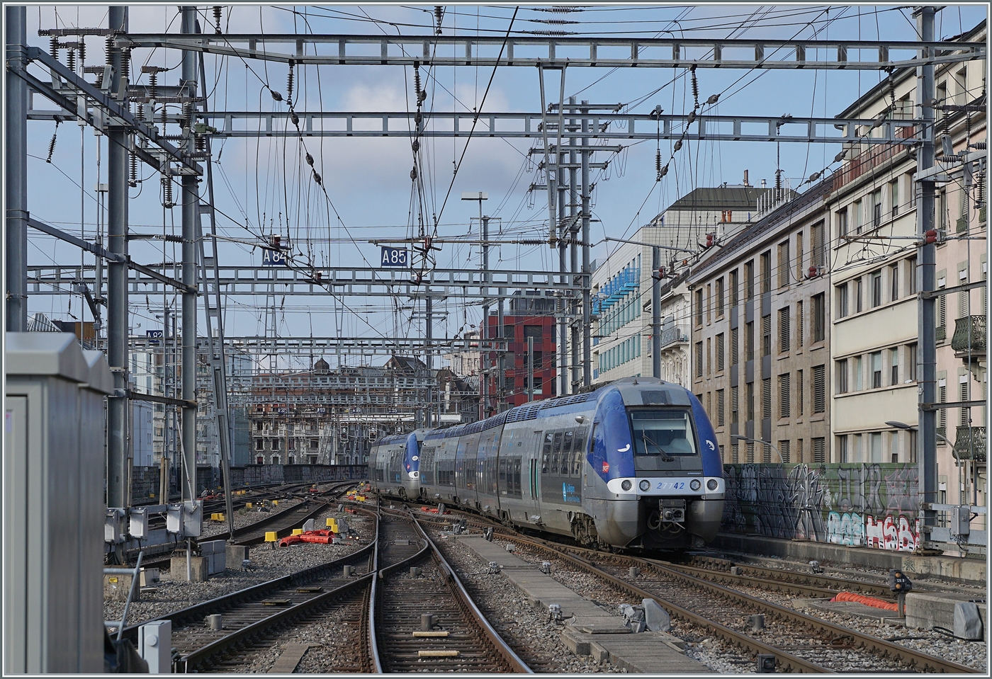 In Genève wartet der SNCF X 31515 M auf die Abfahrt in Richtung Annecy und im Hintergrund der Z 31525 M auf die Weiterfahrt nach Coppet.
