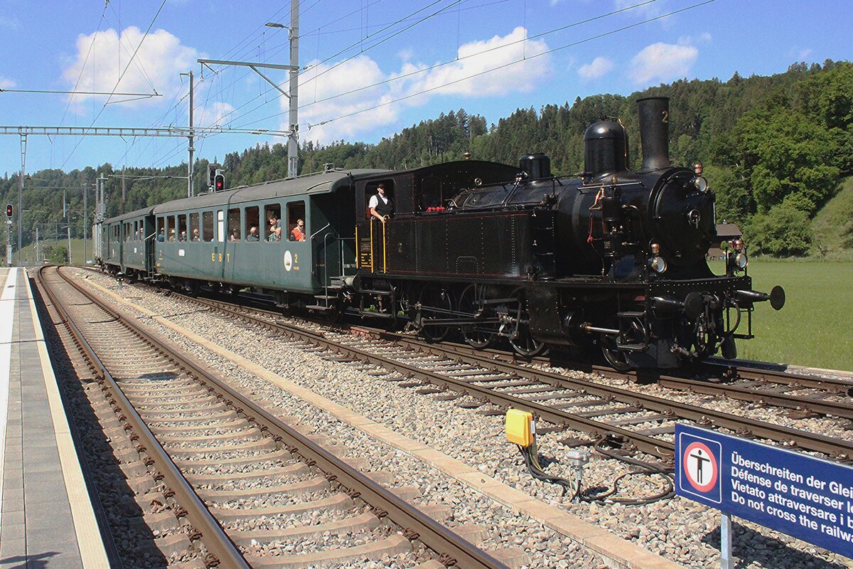 EBT-2 zieht ein Dampfzug durch Grieswald am 18 Mai 2025 während das Spektakel "150 Jahre Emmentalbahn" und wird vom offenbarer Weg fotografiert.