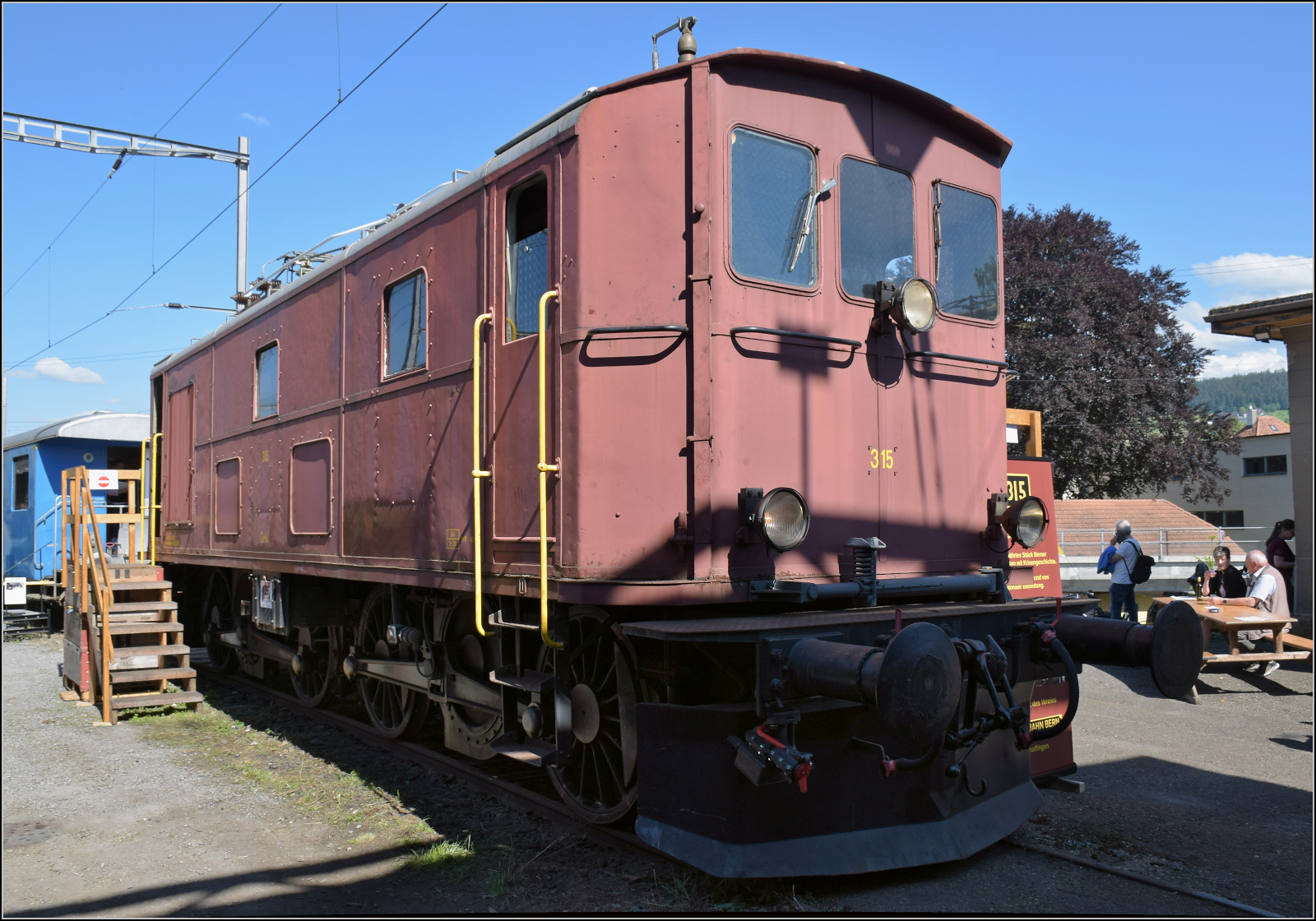 150 Jahre Emmentalbahn. Ce 4/4 315 wurde als Ce 4/6 im Jahr 1922 an die Bern-Neuenburg geliefert. Baulich mit winzigen Vorbauten und mechanisch als kleines Krokodil. Nach Ertüchtigung der Strecken für höhere Achslasten konnten die Laufachsen entfernt werden. Bei dieser Maschine erfolgte der Umbau im Jahr 1956. Konolfingen, Mai 2025.