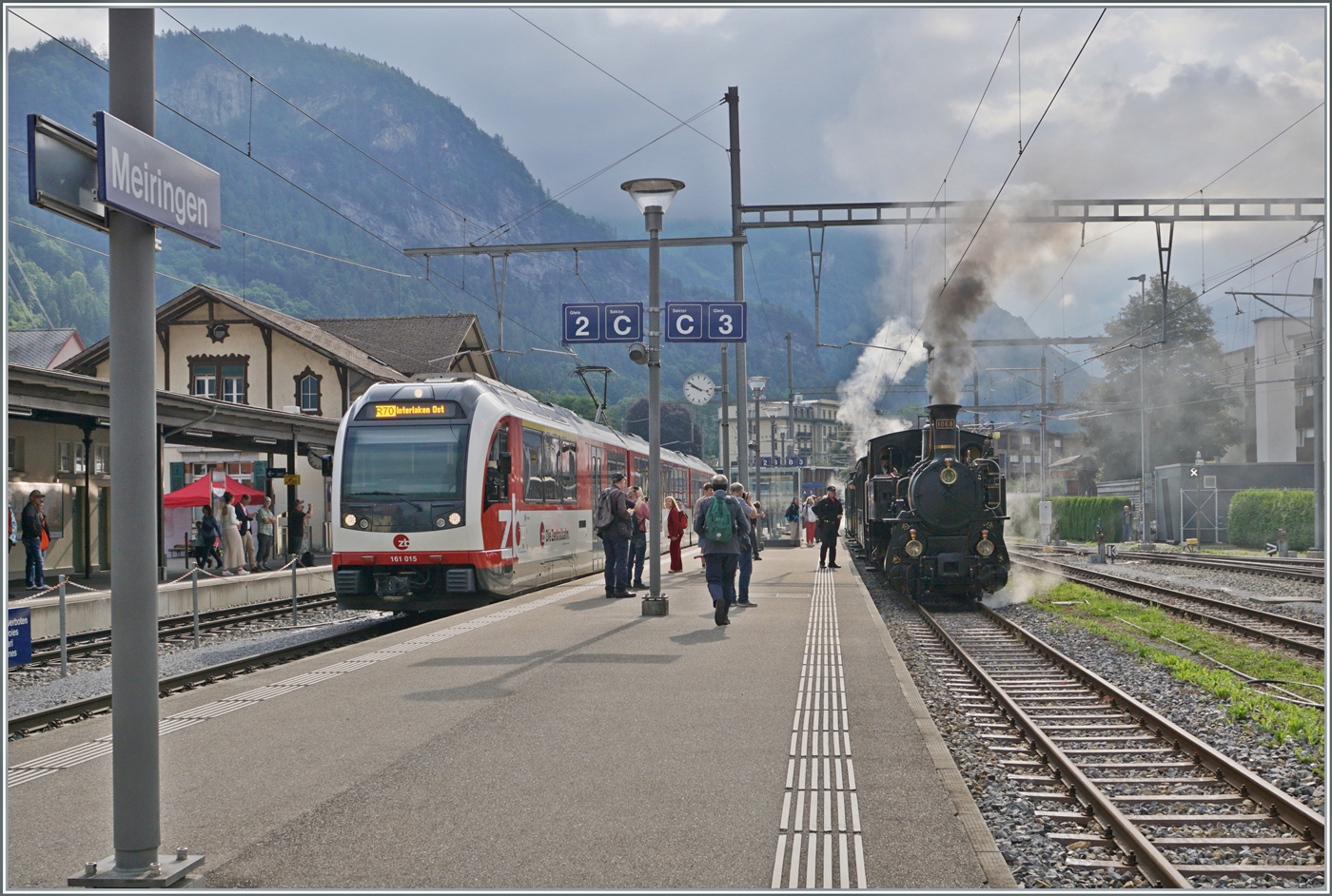 Endlich wieder einmal ein "echter" Brünig-Bahn-Zug in Meiringen! Die SBB HGe 4/4 I N° 1992 "Giswil" erreicht mit ihrem Extrazug zum Jubiläum "20 Jahre Zentralbahn" den Bahnhof von Meiringen.