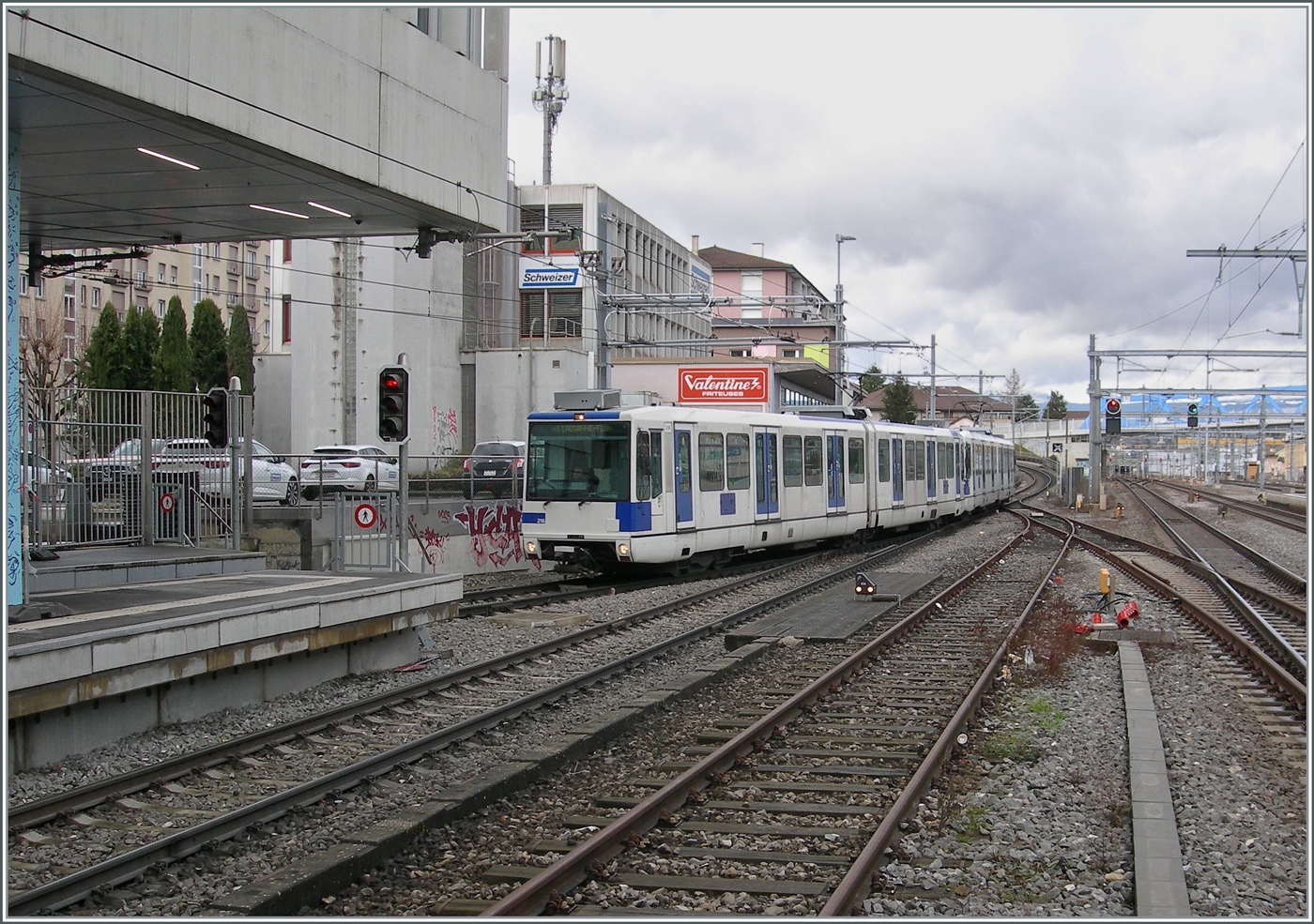Der SBB RABe 523 028 als R6 nach Genève und im Hintergrund zwei TL TSOL Be 4/6 558 Treibwagen als M1 nach Lausanne Flon.