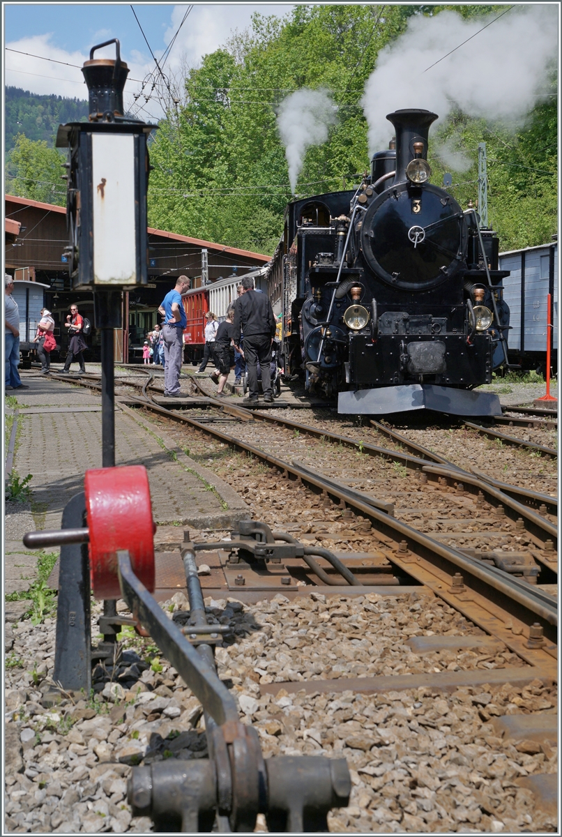 Die BFD HG 3/4 N° 3 der Blonay Chamby Bahn in Chaulin ist mit ihrem Dampfzug aus Blonay in Chaulin Musée angekommen, und während die Reisenden noch aussteigen, wird die Lok abgekuppelt um unmittelbar danach zur Lokbehandlung zu dampfen, damit sie für die baldige Gegenleistung wieder parat ist.