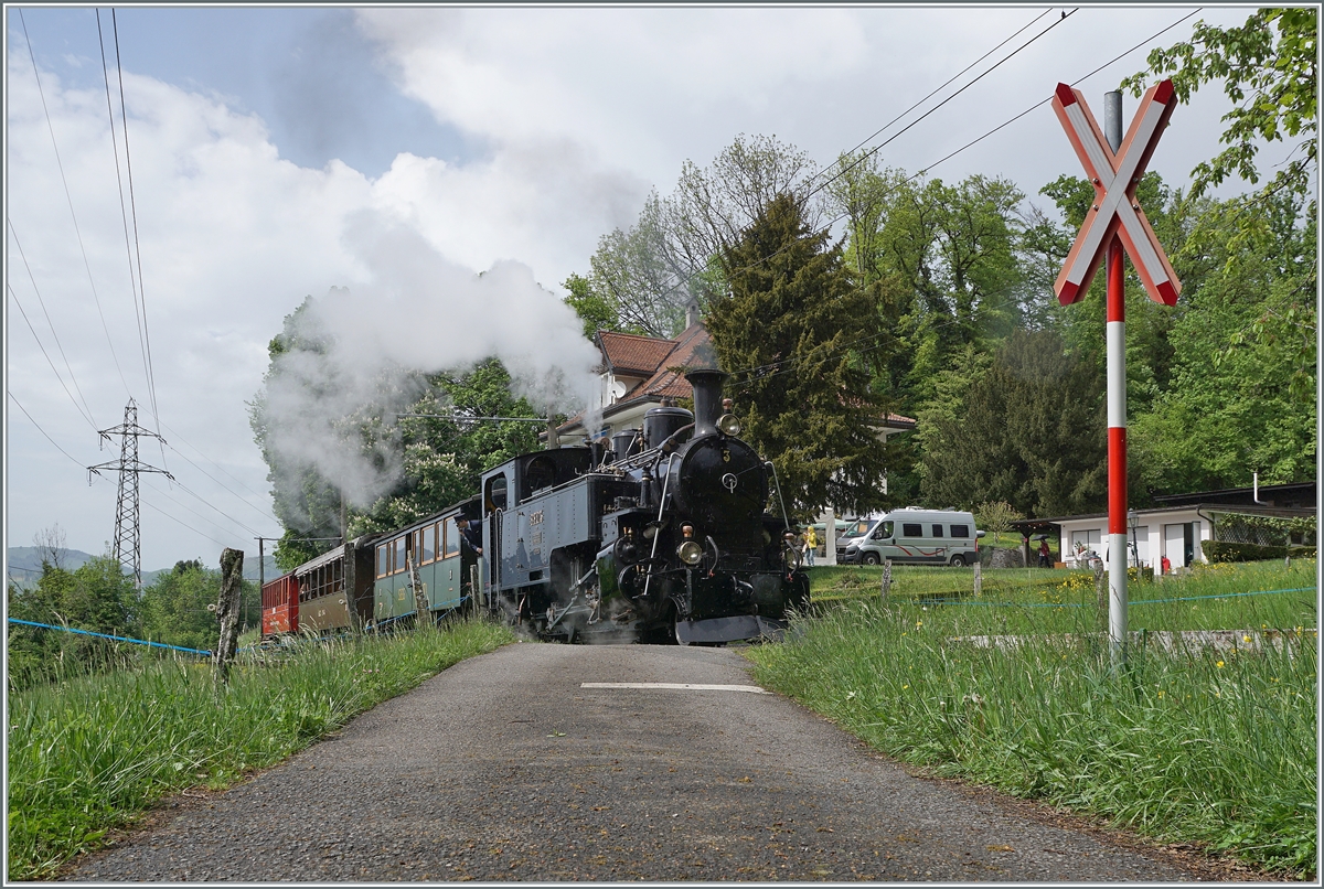 Selbstverständlich gab es zur Saisoneröffnung auch Dampf. Die BFD HG 3/4 N° 3 der Blonay Chamby Bahn mit dem ersten Dampfzug der Saison auf der Fahrt von Blonay nach Chamby bei Chaulin.