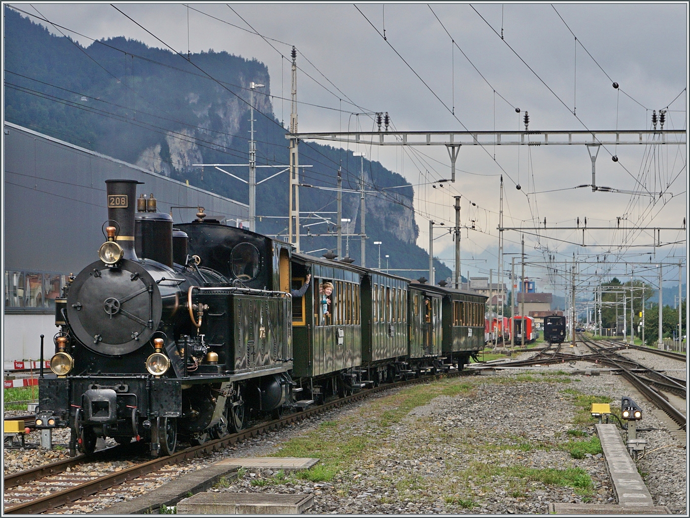 50 Jahre Blonay - Chamby; Mega Steam Festival: Wenn schon schlechtes Wetter, dann richtig... Die SBB HG 3/4 208 (Gastlok der BDB Ballenberg Dampfbahn) rangiert in Blonay und verhüllt mit ihrem Rauch und Dampf die wenig passenden "Sommerwagen". In der Folge, mit Ausnahme eines verregnete Morgens zum Bernina Festivals (Broc/Montreux-Gstaad) verlief aber das Jubiläumsfest bei meist sehr schönem Wetter.