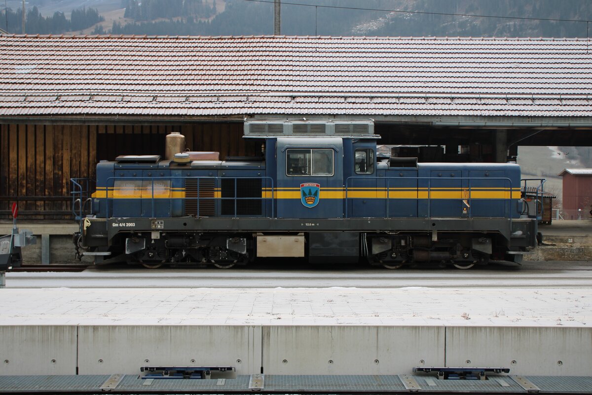 Diesel-elektrische Lokomotive Gm 4/4 2003 "Montbovon" der MOB, abgestellt am 28.05.2012 in Montbovon.