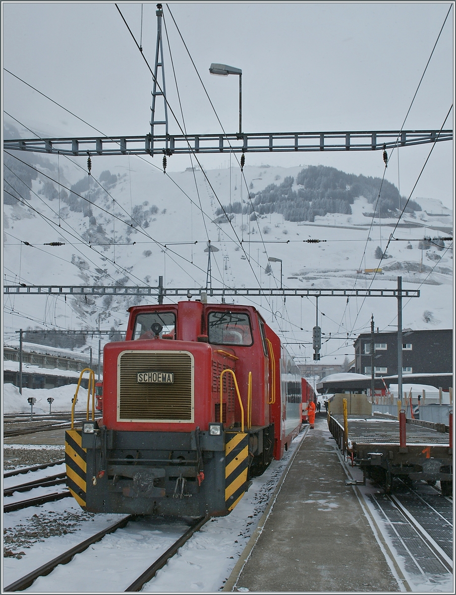 Eine der beiden "Schöma" Tm 2/2 (Loknummer ist aus diesem Blickwinke ersichtlich) beim Rangierdienst in Andermatt. Diese Dieselloks wurden 1960 gebaut und von der FO 1980 von den Itzehoer Zementwerken übernommen. 15. März 2013