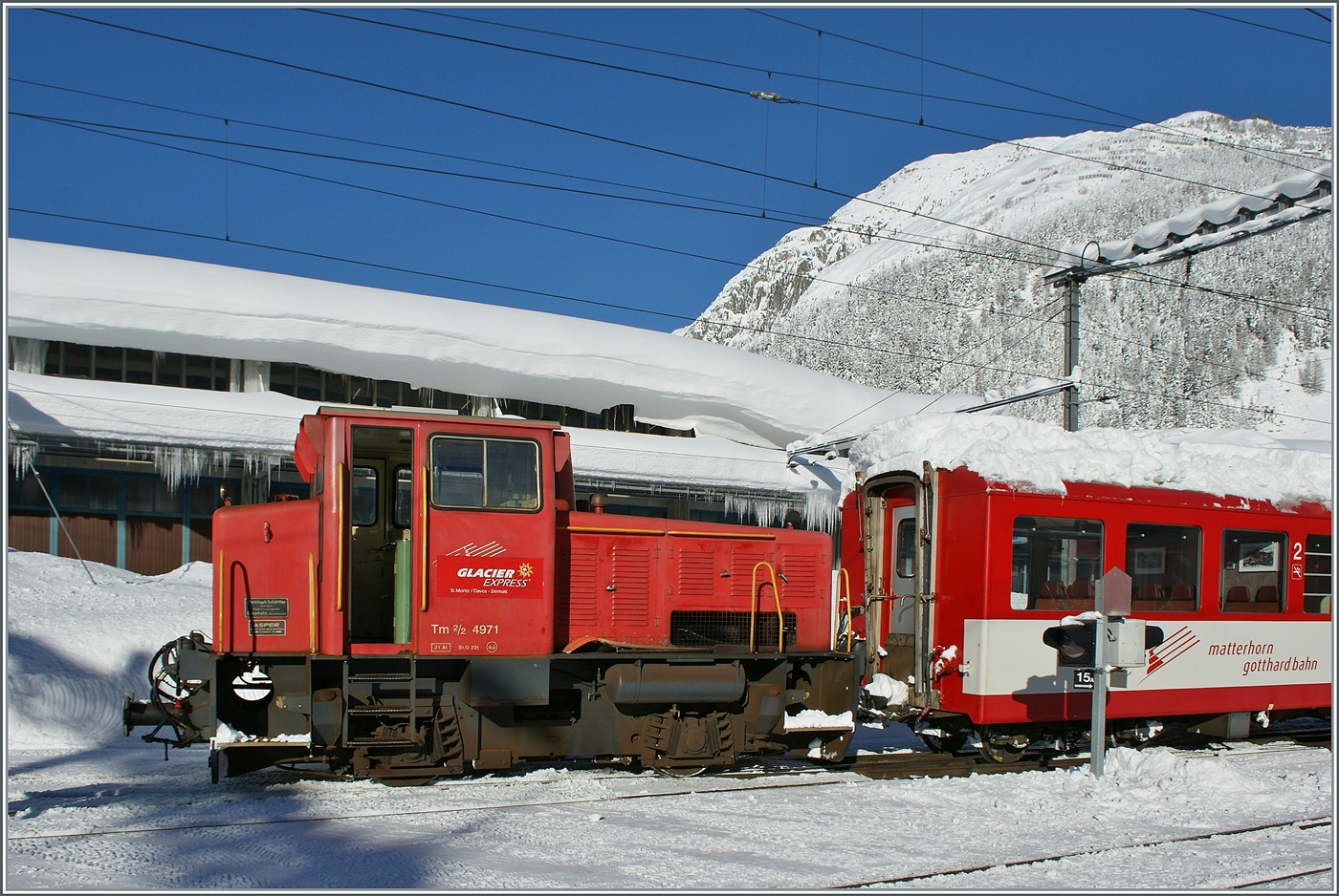 Die "Schöma" Tm 2/2 4971 besorgt in Andermatt den Rangierdienst. Die Lok wurde 1960 gebaut, und von der FO 1980 von den Itzehoer Zementwerken mit einer weiteren Schwesterlok (Tm 2/2 4972) übernommen. 12. Dez. 2012