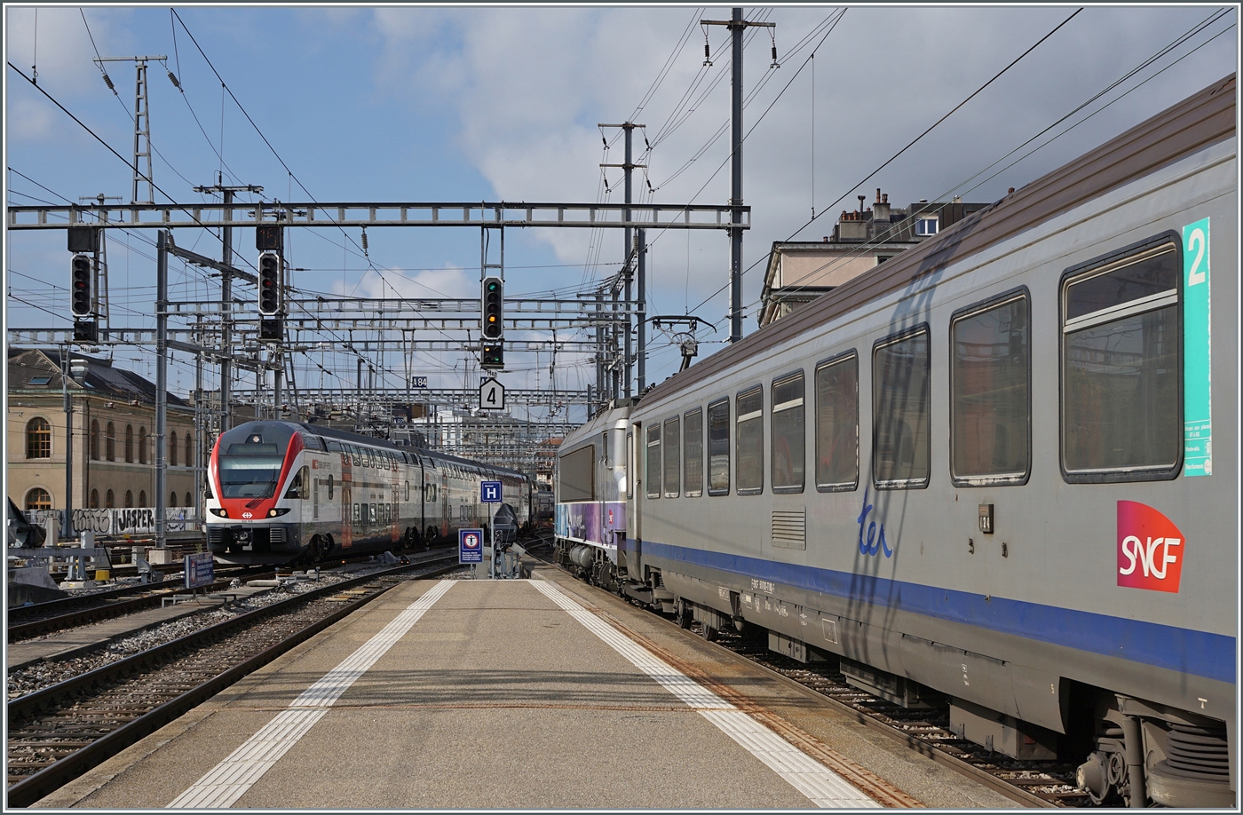 Im Bild die Regionalzüge 4018 und 4019 von und nach La Plaine beim Wenden in Genève mit der Bm 4/4 18410 Seite Genève und einer weiteren Seite La Plaine.