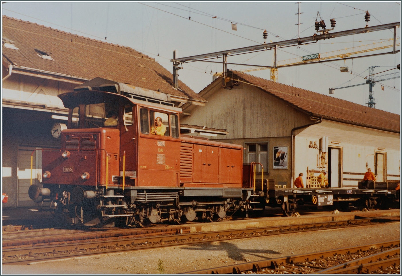 In Reinach SBB rangiert die SBB Em 3/3 18835 Flachwagen für den Zirkus Knie. 22. Juli 1987