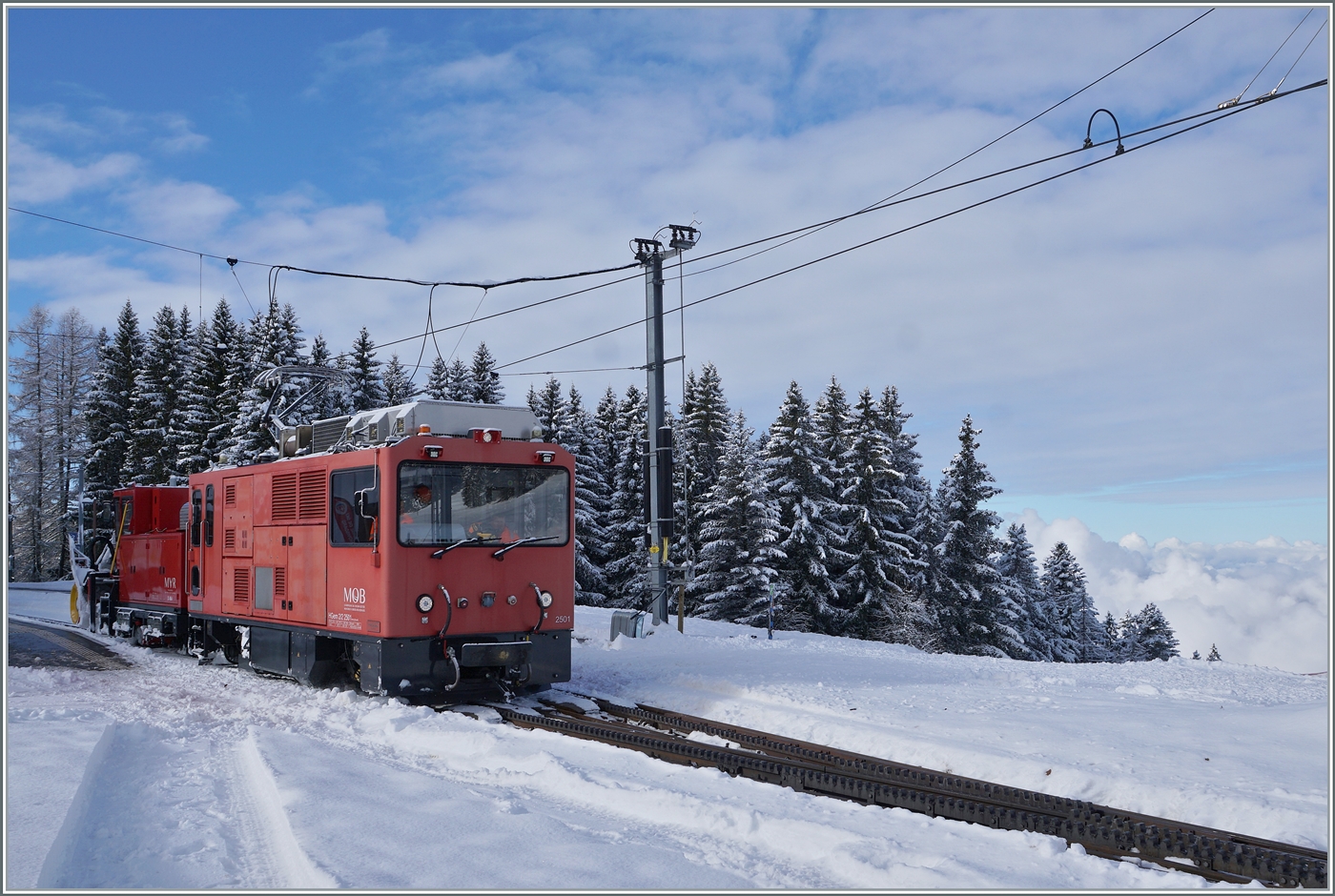 Es hat geschneit und da muss, wie üblich, die HGem 2/2 2501 mit dem X464 zur Schneeräumung auf den Les Pléiades ausrücken. Das Bild zeigt die HGem 2/2 2501 nach getaner Arbeit beim Verlassen der Gipfelstation Les Pléiades in Richtung Blonay fahrend. Im rechten Bildteil öffnet sich der Blick auf des Nebelbedeckte Mittelland, wobei der Nebel sich in der Folge auch in den Bergen ausbreitete. 29. Januar 2026