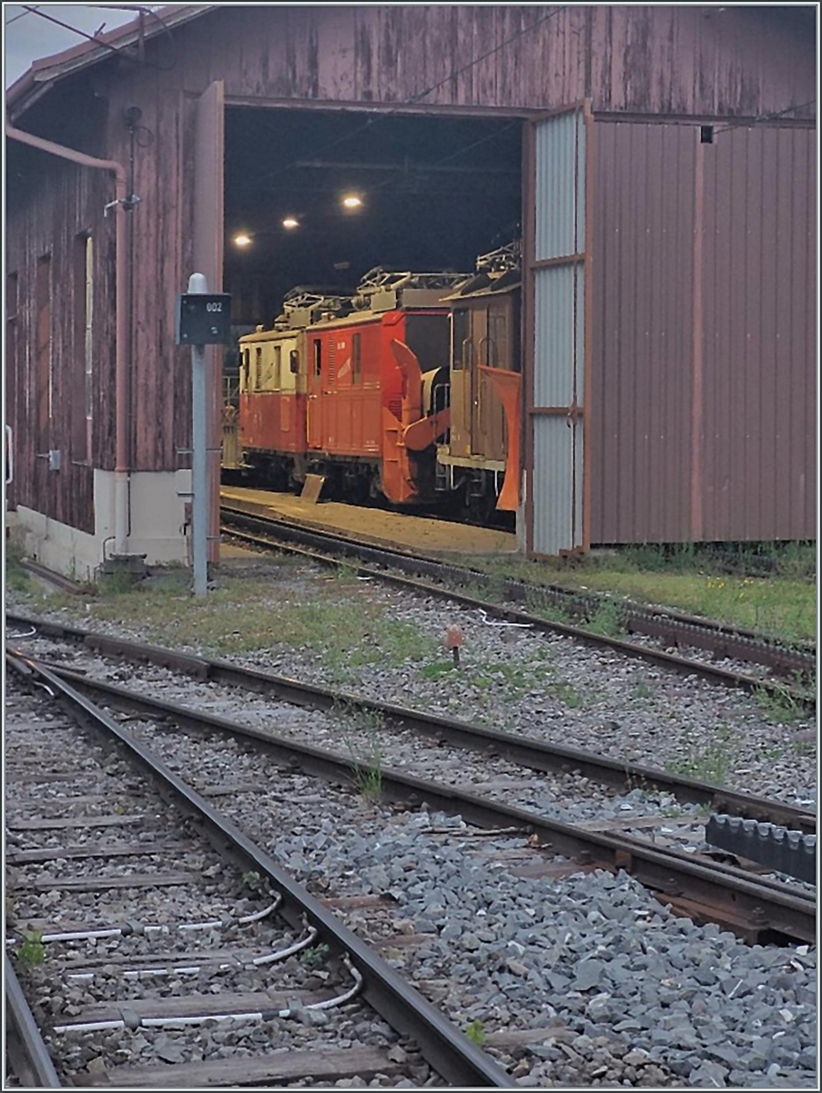 Leider nur in schlechter Handy Qualität: ein Blick ins Dépôt auf die beiden CEV He 2/2 Nr. 1 und 2.