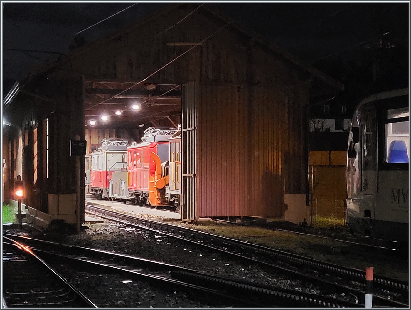 Ein paar Schneeflocken haben den CEV MVR  Schneeräumungszug  aus dem Lokschuppen in Blonay herausgelockt, so dass nun der Blick in Innere frei ist und zeigt, was ich lange vermutete: Die CEV HGe 2/2 N° 2 ist immer noch in Blonay: Des weiteren ist auch die HGe 2/2 N° 1 und die Xrot91 zu erkennen.