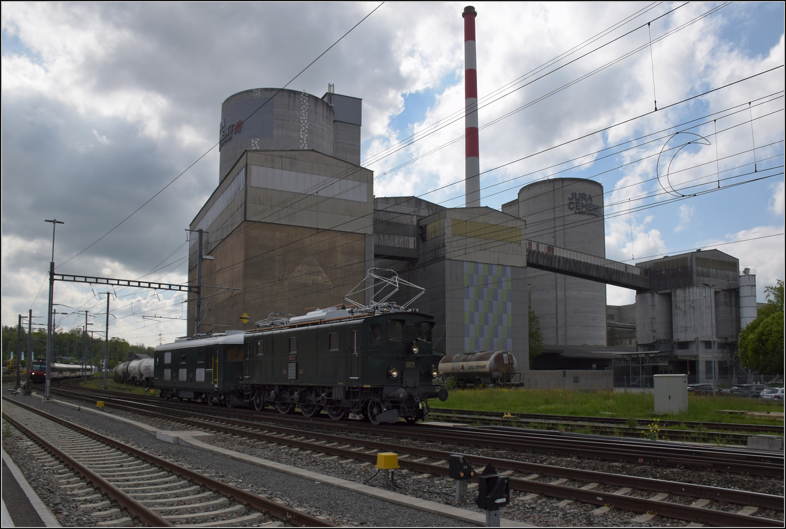 Zum Fest 150 Jahre Nationalbahn durfte Bm 4/4 II 18451 nach einer kleinen Ewigkeit von 10 Jahren endlich wieder an die frische Luft und wurde von Ae 3/5 10217 an ihren früheren Einsatzort nach Etzwilen gebracht. Hier in Wildegg, April 2025. Zum letzten Mal war die Lok auf den Abschiedsfahrten 2015 des Dreischienengleis Wohlen-Bremgarten im Einsatz ( http://igschieneschweiz.startbilder.de/bild/schweiz~dieselloks~am-44-bm-44-ii/439393/bdwmdvzodbbsbb-ueber-das-wochenende-vom-26.html ). Damals krankte sie an der Motorkühlung und stellte sich unterwegs zeitweise ab. Mittlerweile ist sie weitgehend aufgearbeitet, aber das Kühlsystem ist noch teilweise in Arbeit. Daher wird ihr eine Fahrt nach Singen verwehrt bleiben ( http://igschieneschweiz.startbilder.de/bild/deutschland~bahnhof~singen-htw/470596/am-bahnhof-von-singen-hohentwil-sbb-zug.html ). Im Rangierdienst wird sie am Fest jedoch genug Arbeit haben und sich wunderbar präsentieren können.